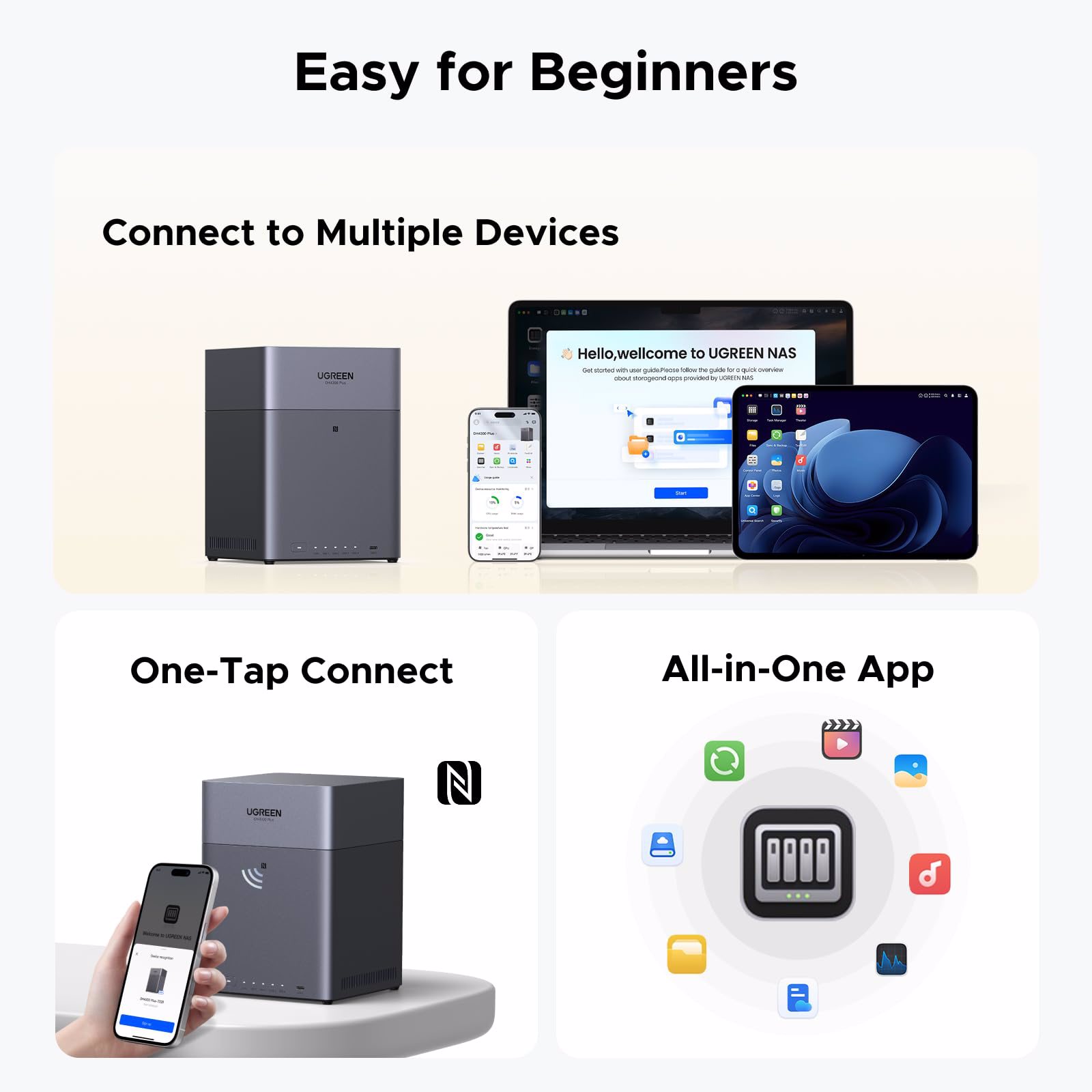 User-Friendly App & Easy to Use: Connect quickly via NFC, set up simply and share files fast on Windows, macOS, Android, iOS, web browsers, and smart TVs. You can access data remotely from any of your mixed devices. What's more, UGREEN NAS enclosure comes with beginner-friendly user manual and video instructions to ensure you can easily take full advantage of its features.