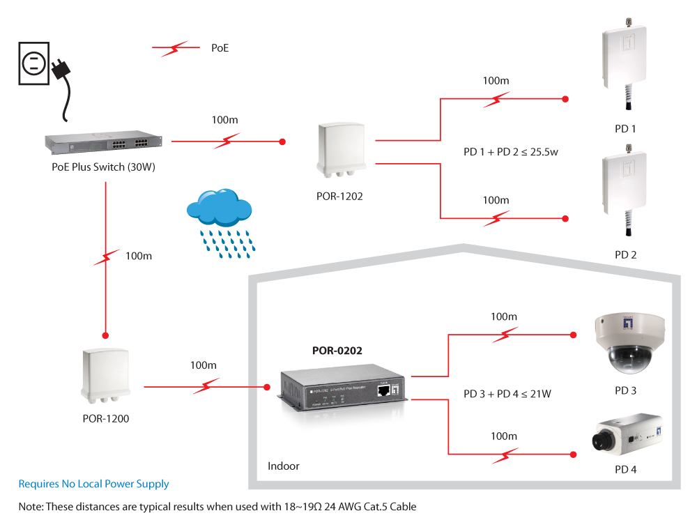 - Multiple PoE repeaters can be deployed by daisy chain to extend range