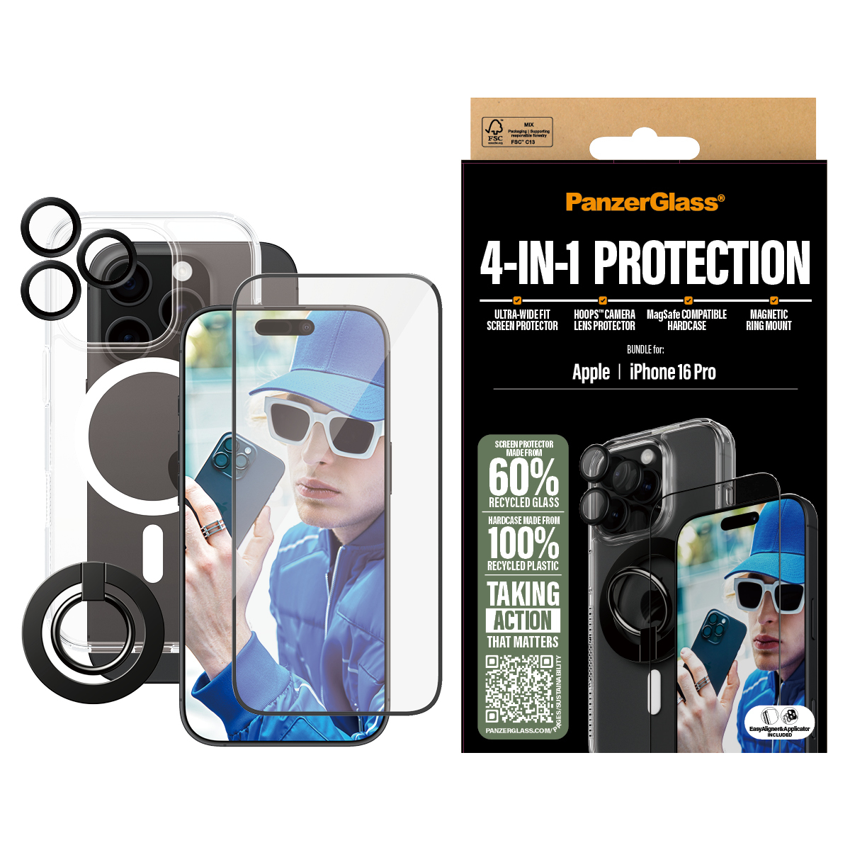 Bagsiden af denne HardCase er lavet af 100% genbrugsplast, og den kommer endda med en aftagelig magnetisk ringholder, der gør det nemt for dig at bruge din telefon med én hånd uden at tabe den. Skærmbeskytteren er lavet af 60% genanvendt glas og giver høj ridsemodstand. Og Hoops® kamera linsebeskytteren? Den holder dine kameralinser fri for ridser, der ellers ville efterlade permanente mærker på alle fremtidige fotos.
