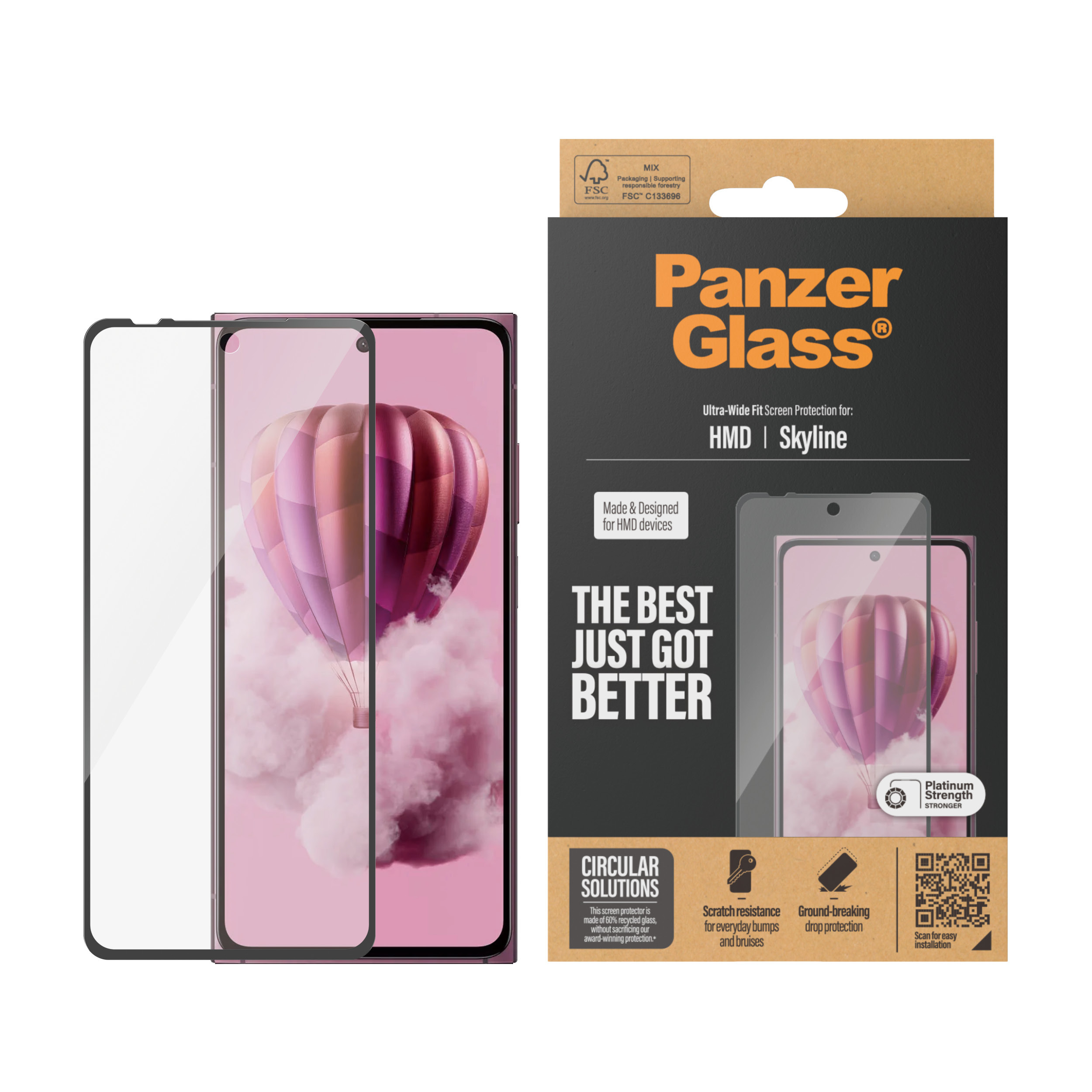 Skærmbeskytteren har størrelsen “Ultra-Wide Fit”. Det betyder, at den dækker fronten af din telefon, samtidig med at den giver dig en krystalklar skærmoplevelse og efterlader lidt plads langs kanterne til et cover. Vil du give din telefon 360-graders beskyttelse, kan du kombinere skærmbeskyttelsen med et PanzerGlass® cover og en PanzerGlass® PicturePerfect eller Hoops kameralinsebeskytter.