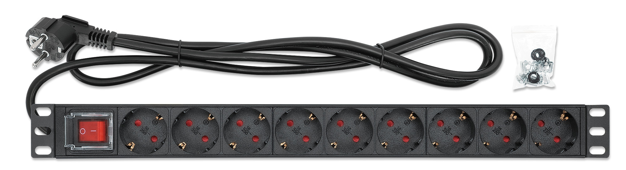 Plug your networking, telecom, surveillance, AV or other electronics into this 9-outlet 19” PDU from Intellinet Network Solutions. It is compatible with standard electrical equipment and features nine EU Type E/F outlets in a durable black aluminum housing. This PDU mounts in 1U of space in 19-inch racks. The illuminated on/off switch provides one-touch control over all connected devices and has a protective hinged cover to prevent accidental shutdown.