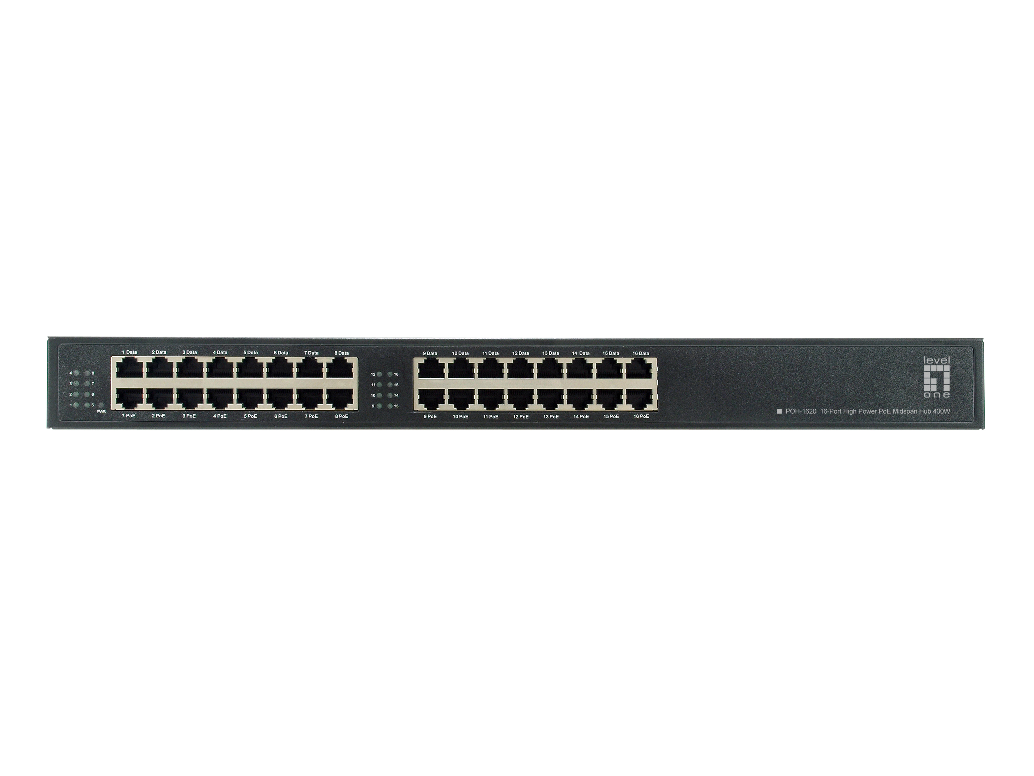 LevelOne POH-1620 16 GE PoE Hub is equipped with 16 RJ-45 ports featuring PoE function to eliminate the bulky power cable need while implementing your network infrastructure thus allowing greater flexibility in the locating of network devices and significantly decreasing installation casts.Easy to Use the compact 19'', IU rack-mountable design enables the switch to be easily located in a server room in order to centralize power management and simplify network integration for various applications. For all the functions featured in POH-1620 users can get the benefits of flexible network solutions that can simplify the installation of wireless access points, IP cameras, IP phone and other devices or applications in the network.