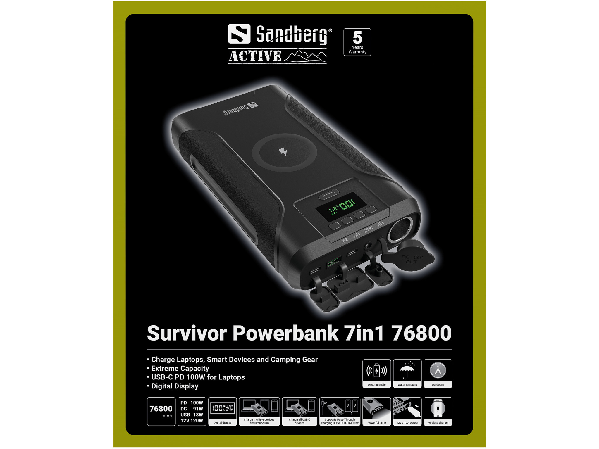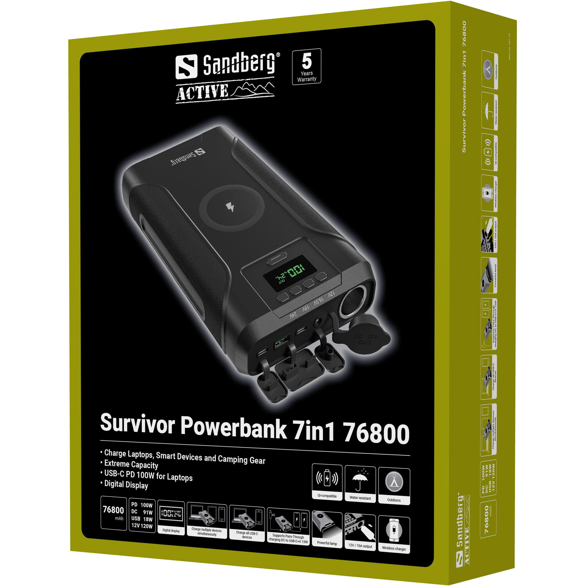 Sandberg Survivor Powerbank 7in1 76800 er den ultimative transportable ladestation til stort set alle dine gadgets. Det enorme batteri på 76800 mAh er i sig selv nok til at genoplade din smartphone dagligt i næsten en hel måned. Powerbanken er udstyret med et væld af stik for forskellige opladningsmuligheder: