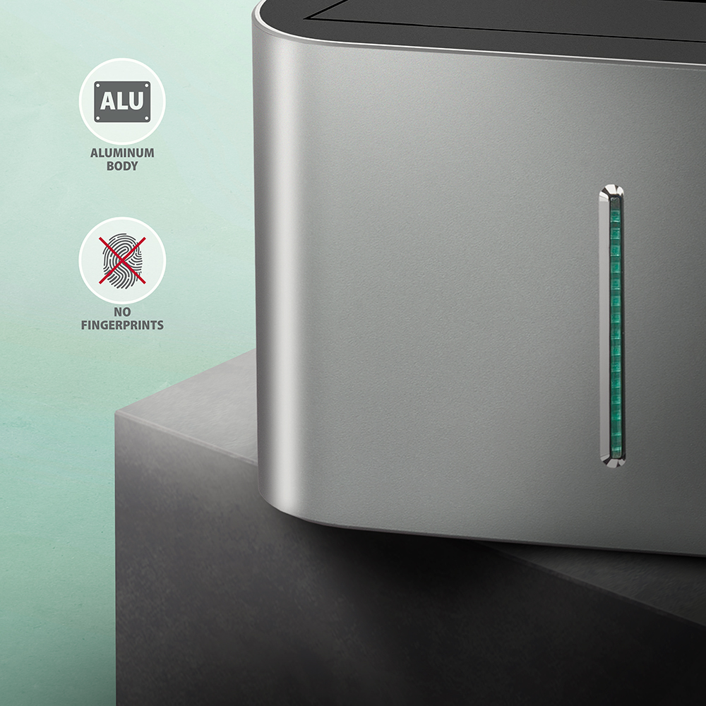 The station case is sufficiently robust and durable, which allows perfect stability even with inserted disks. Rubber anti-slip pads prevent sliding on the table and vibrations of the hard drives. The outer casing is made of aluminum with an elegant brushed surface.