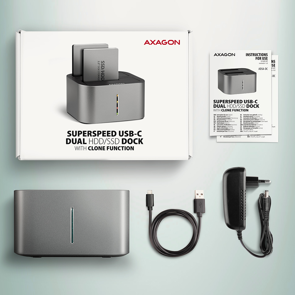 SuperSpeed USB-C 5Gbps docking / cloning station AXAGON ADSA-DC DUAL CLONE easily and quickly connects up to two 2.5" or 3.5" drives to the computer at the same time. The connection to the computer is enabled by the modern double-sided USB-C connector on the dock together with the supplied USB-C <-> USB-A cable with a length of 80 cm.