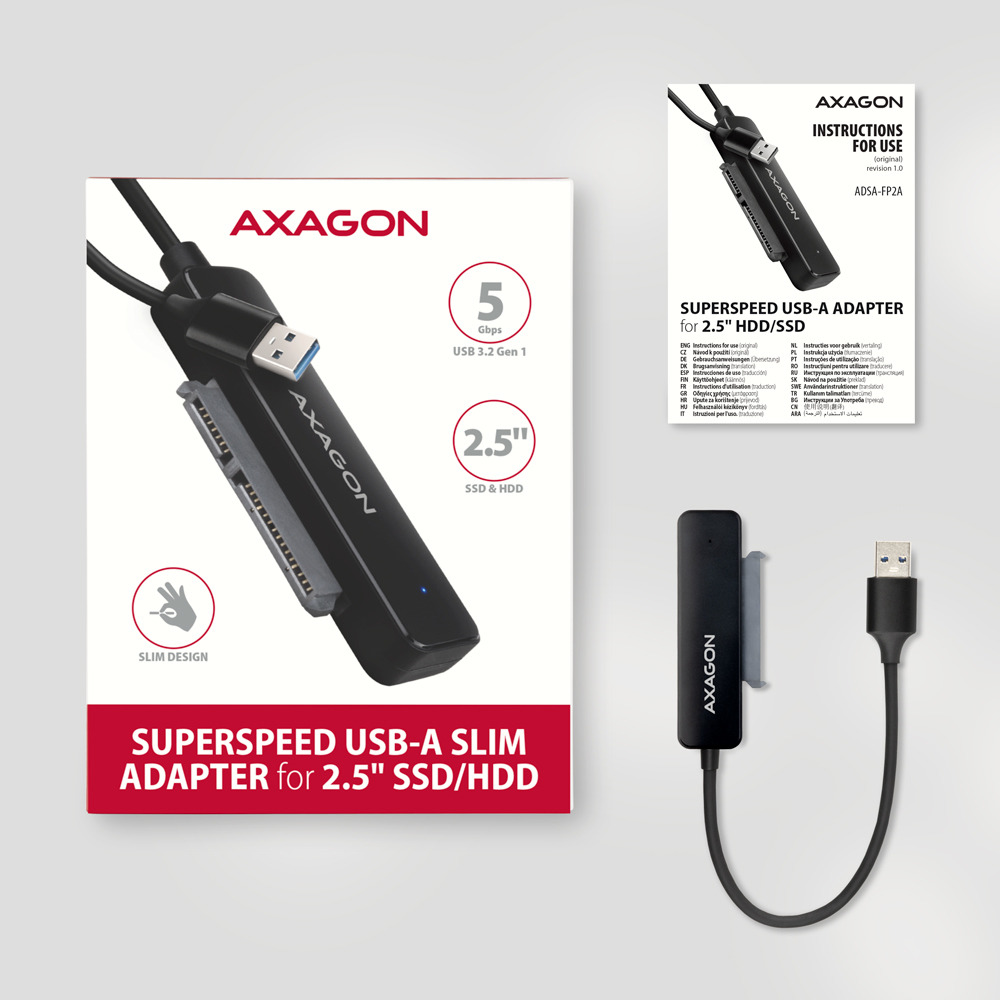 Compact AXAGON ADSA-FP2A SLIM adapter with USB-A 5Gbps and SATA 6G interface for 2.5" SATA hard drives or SSDs. The connection to the computer enables a permanently attached USB-A cable 20 cm long. Thanks to the USB 3.2 Gen 1 interface, the transfer rate is up to 5 Gb/s, and the Plug & Play function ensures automatic connection to the computer.