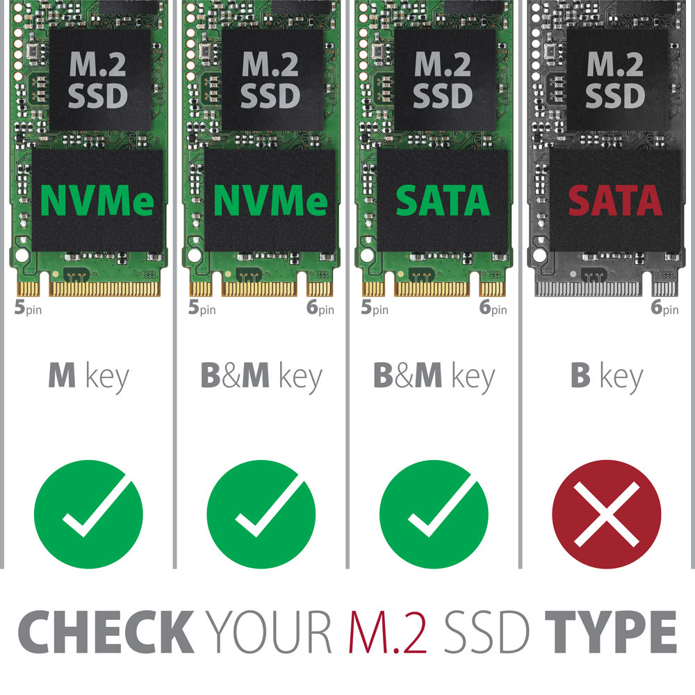 • Support of M key or B+M key NVMe (PCI-Express) and SATA (AHCI) M.2 SSDs without maximum capacity limitation.