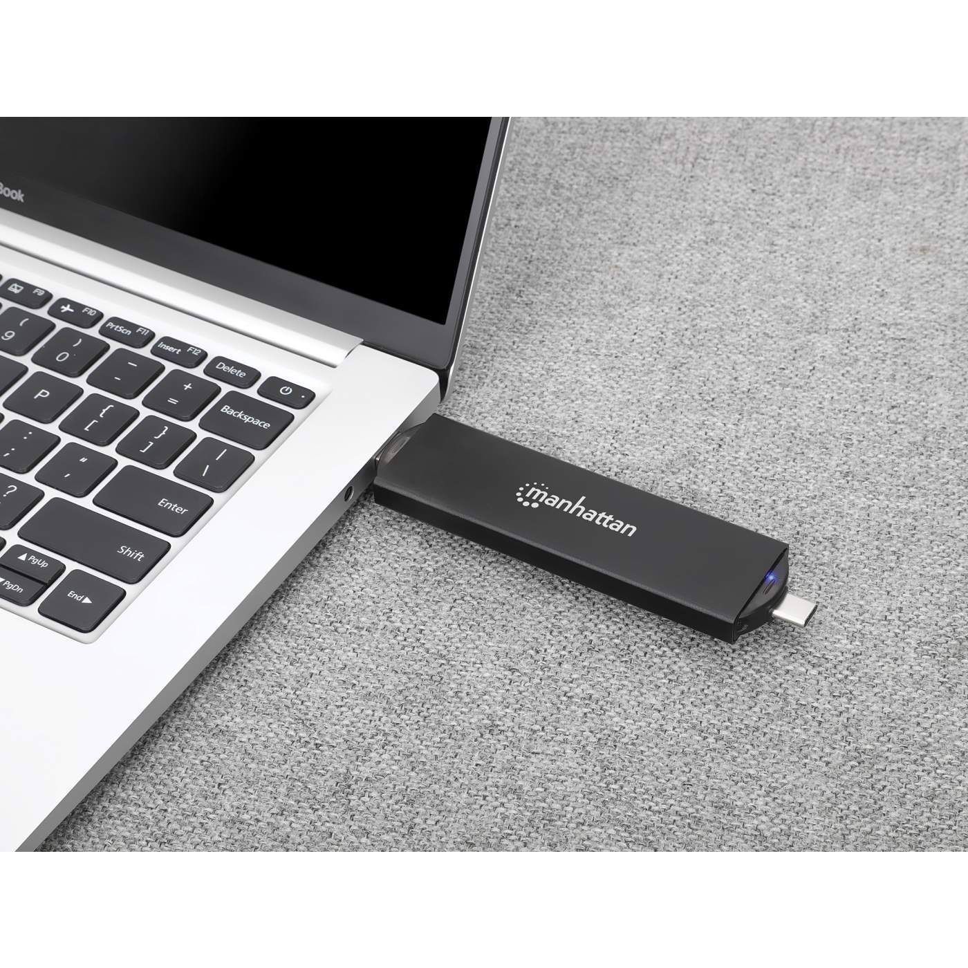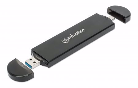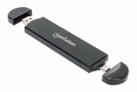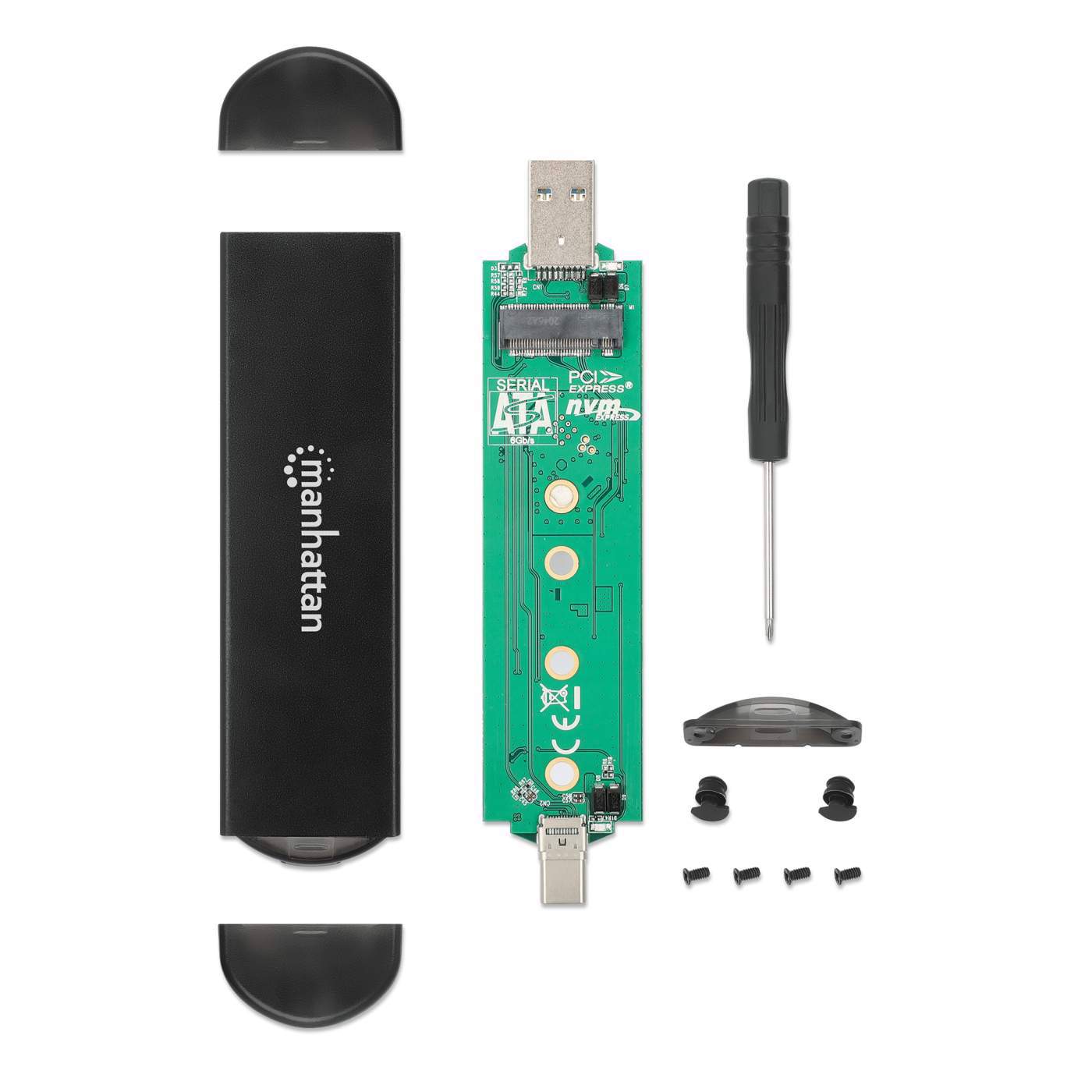 This compact solid-state drive (SSD) enclosure from Manhattan lets you add highly portable USB-based data storage to a PC, laptop, tablet, smartphone, Chromebook and MacBook®. Working with both M Key (NVMe/PCIe) and B+M Key (SATA) drives, it ensures compatibility with M.2 SSDs from Western Digital®, Kingston®, Seagate®, Samsung® and more that are sized 2230, 2242, 2260 or 2280.