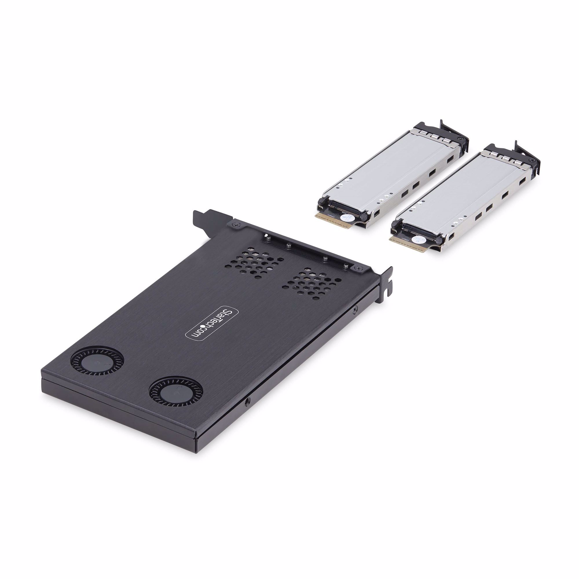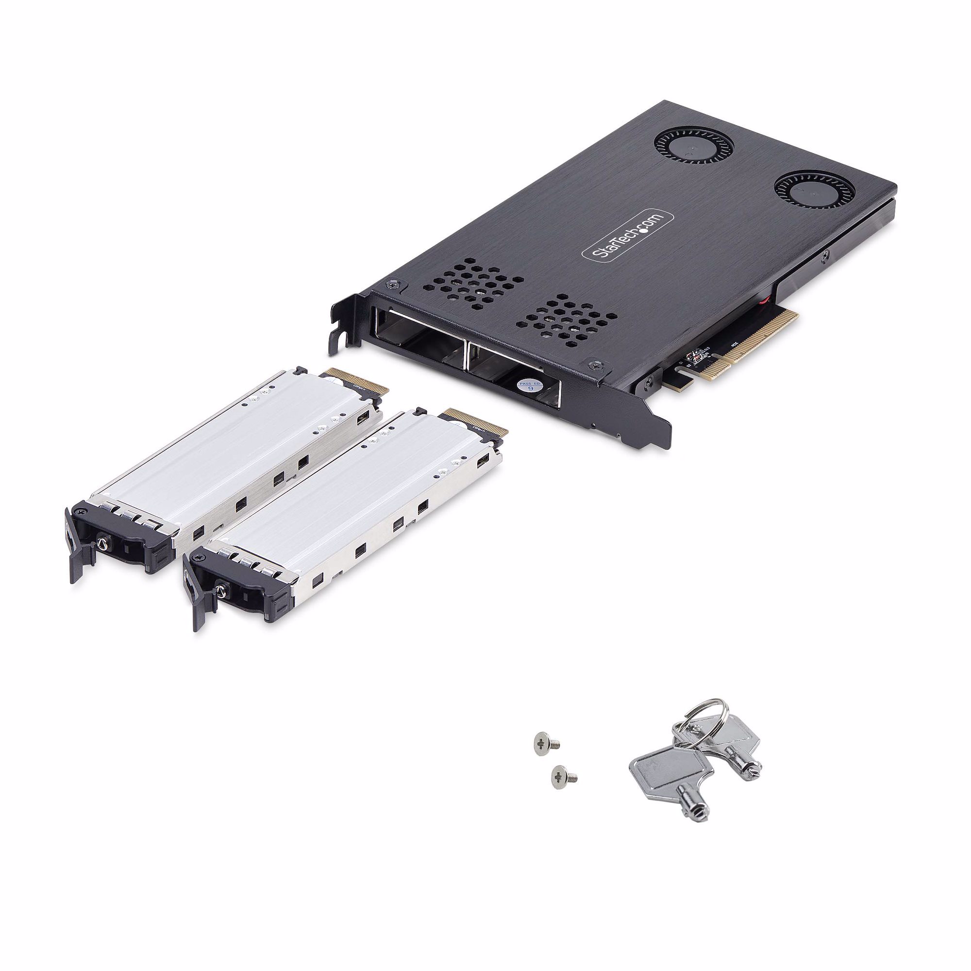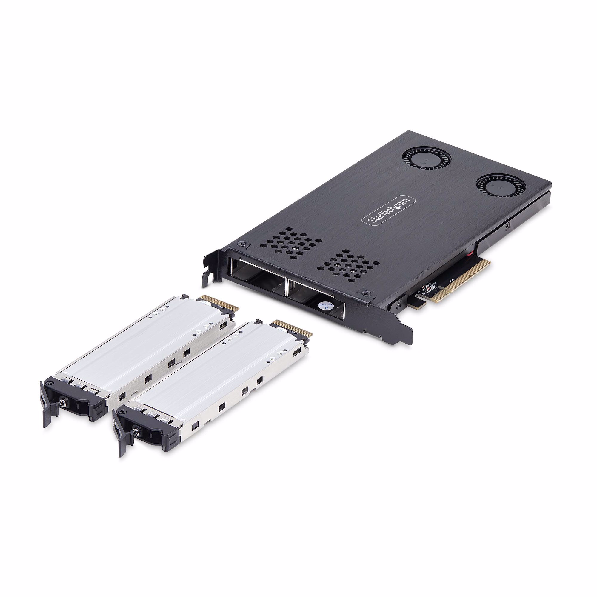Use an available PCIe x8 or larger expansion slot to create two removable M.2 NVMe drive bays