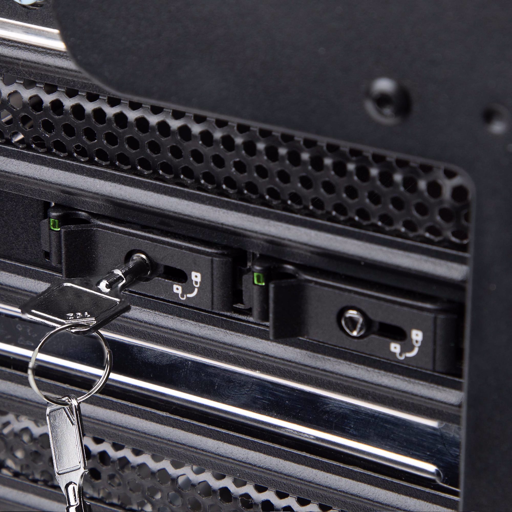 Toolless installation allows an M.2 drive to be placed into the drive tray or inserted into the drive bay without needing tools. It features a power/activity LED indicator, a latching drive tray, and a lockable installation with two included keys.