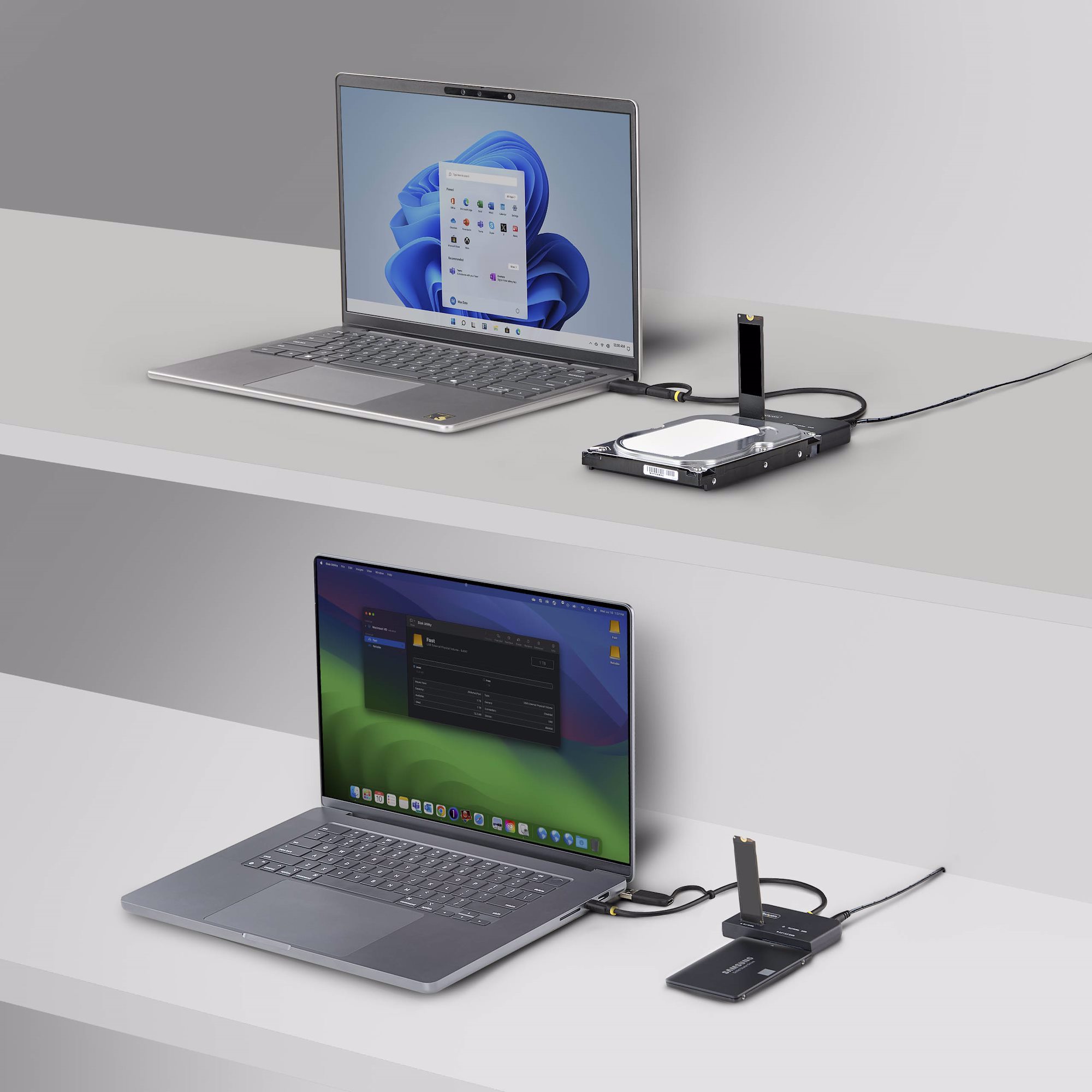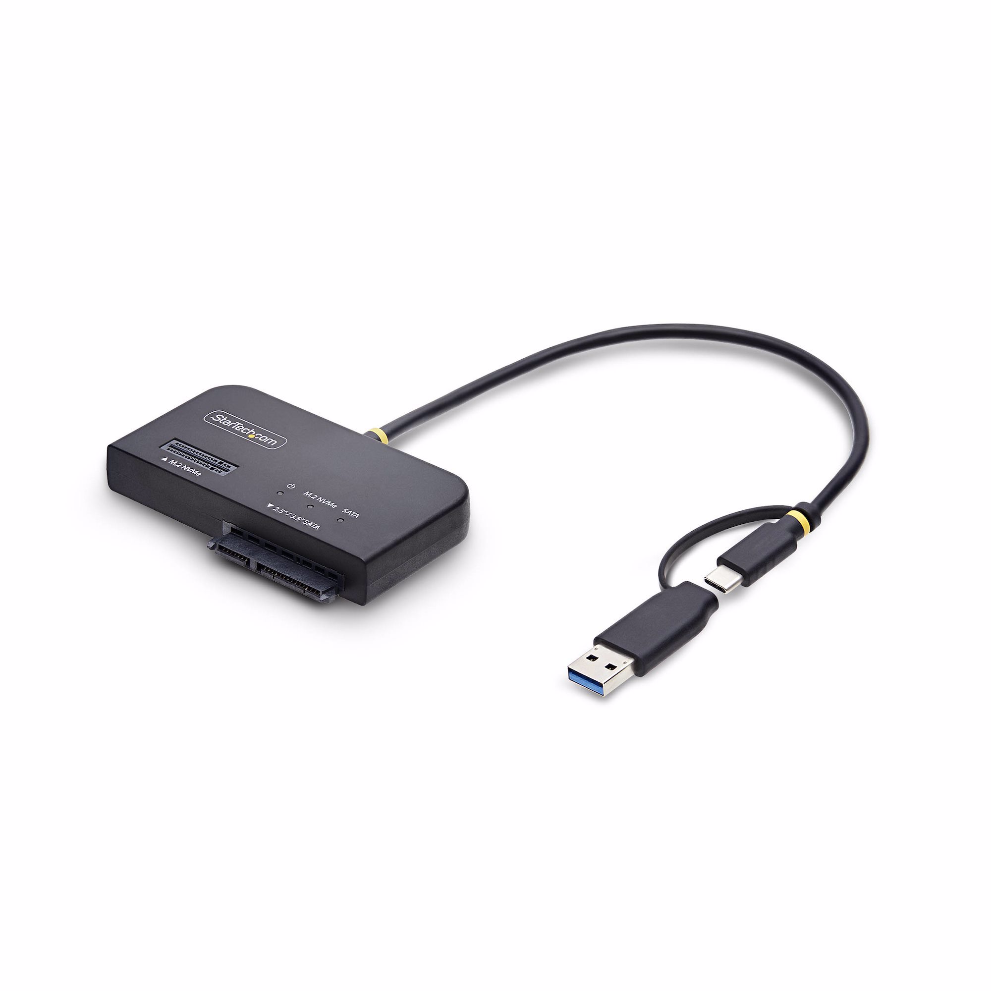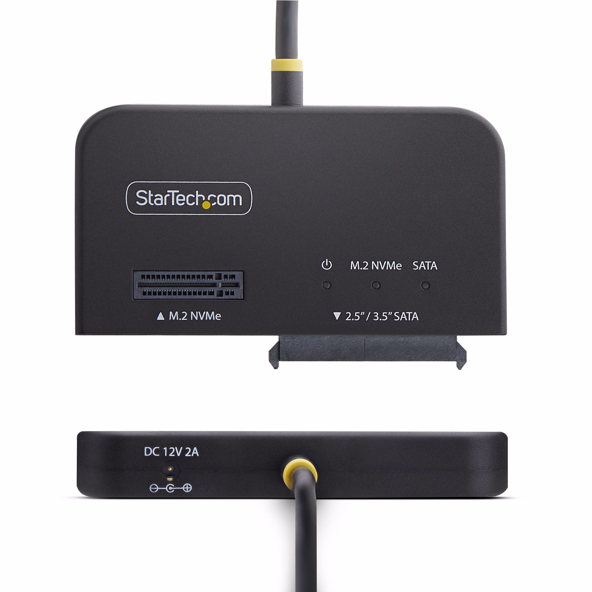 Access and manage M.2 NVMe and 2.5 in/3.5 in SATA SSDs/HDDs through a single USB-C or USB-A 10Gbps connection. The 2-in-1 NVMe and SATA adapter enables simultaneous read and write access for fast data transfer, recovery, and upgrades. This hard drive reader is a versatile solution for IT professionals performing backups, disk imaging, or maintenance on M.2 NVMe and legacy SATA drives.