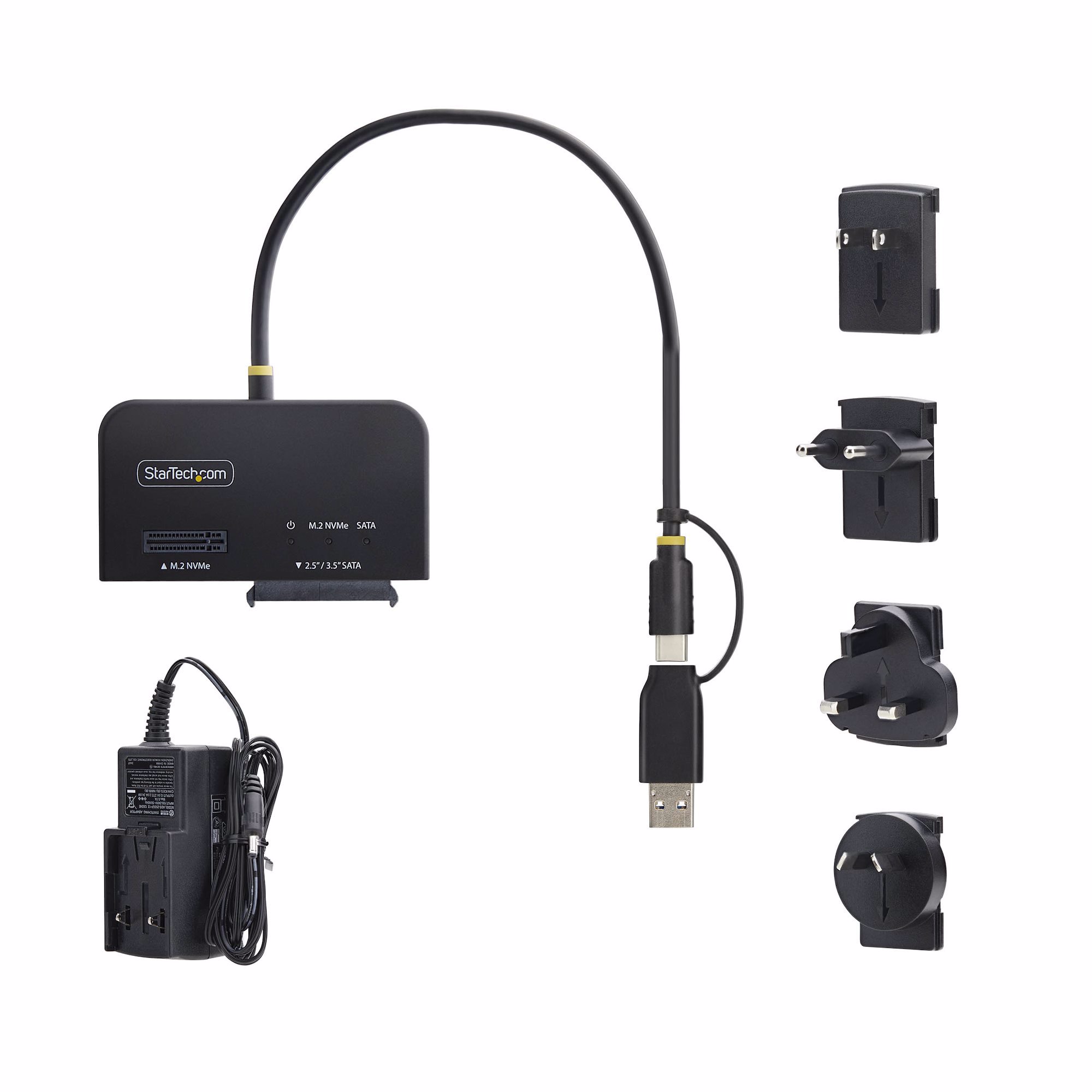 Lightweight and portable, the adapter fits easily into any IT toolkit or workspace. It runs on USB bus power for a single 2.5 in SATA or M.2 NVMe drive, and includes a universal power adapter required for 3.5 in SATA drives, for connecting two drives at once, or when a single drive draws more power than USB can provide. Ideal for IT technicians and end users needing portable, tool-free drive access.