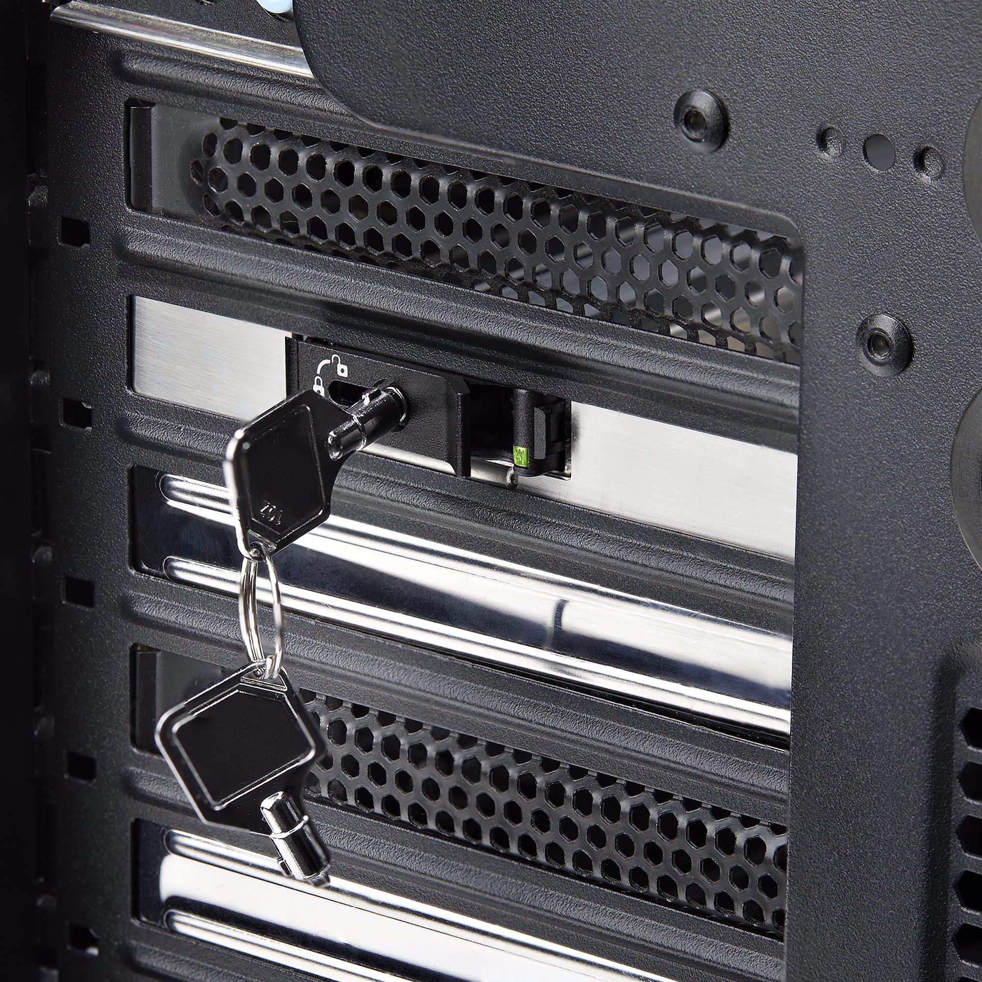 Install an M.2 drive into the drive tray and insert the tray into the drive bay, without the need for tools. The drive tray features a power/activity LED indicator to monitor drive status. A latching mechanism with optional lock (2 keys included) deters the theft of mission-critical data storage devices.