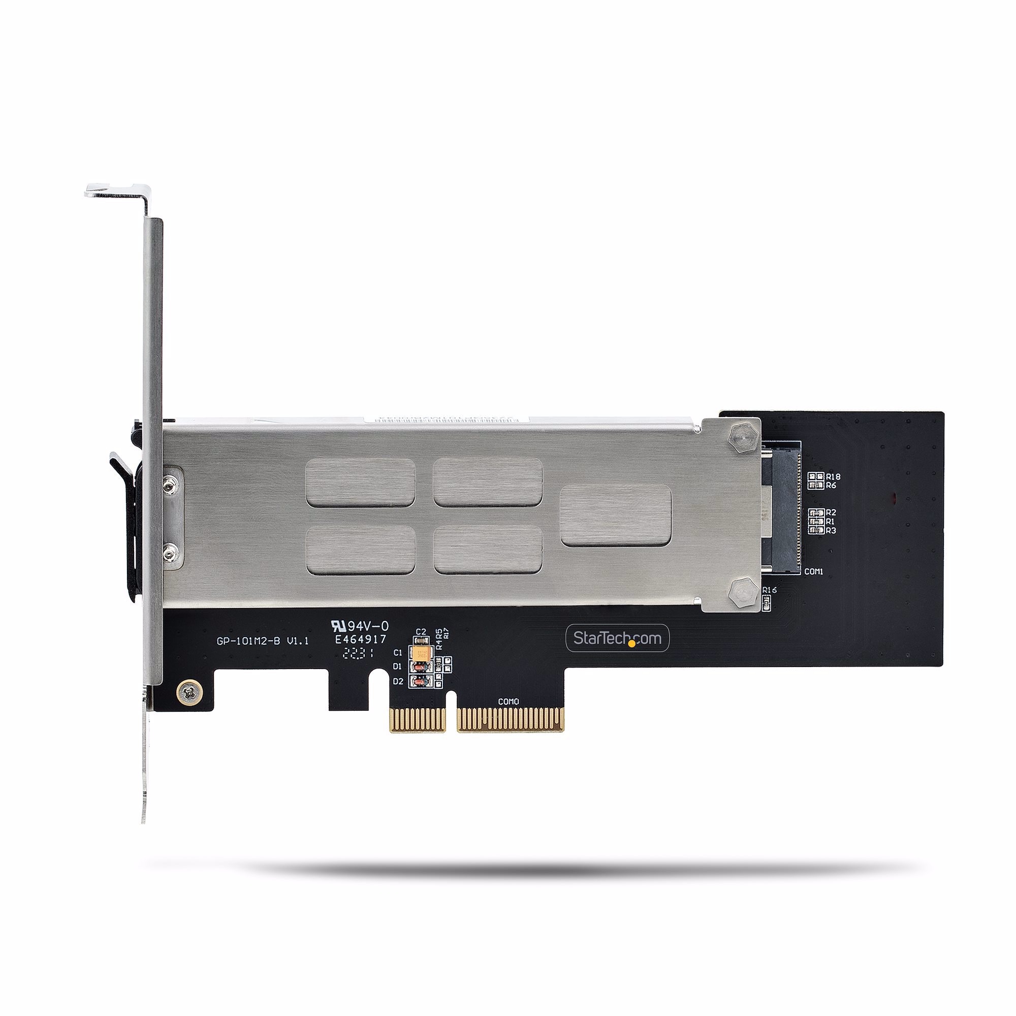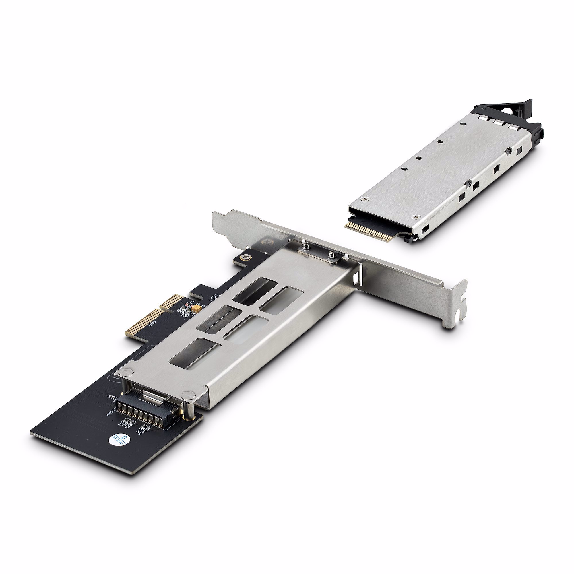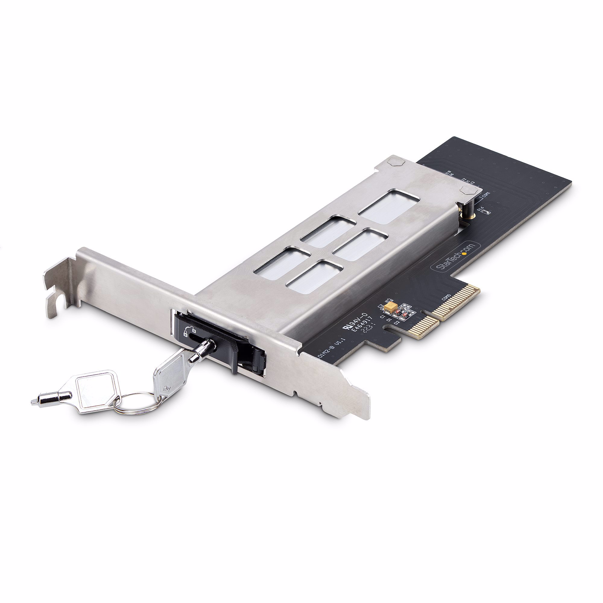 Install into a PCIe x 4 (and up) expansion slot to add a removable and lockable M.2 NVMe drive tray (drive not included)