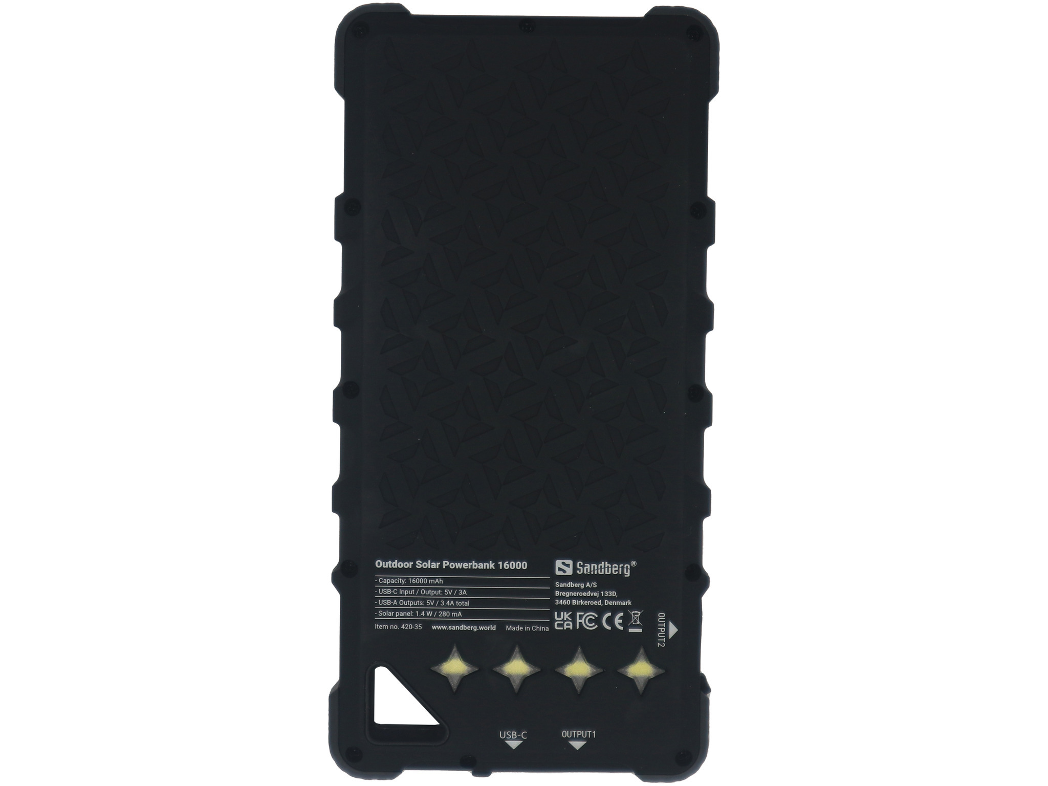 Sandberg Outdoor Solar Powerbank 16000 er et portabelt batteri, som oplades via en USB port eller de indbyggede solceller. Med en opladet Outdoor Solar Powerbank 16000 i bagagen er du således sikker på altid at kunne oplade dine enheder hvor som helst og når som helst – uden at være afhængig af en stikkontakt. Du får op til 6 opladninger af en typisk smartphone, og med en solid og regnsikker indpakning holder den også under barske forhold. Kan oplade op til to enheder samtidig. Glæd dig til en fremtid uden døde batterier!