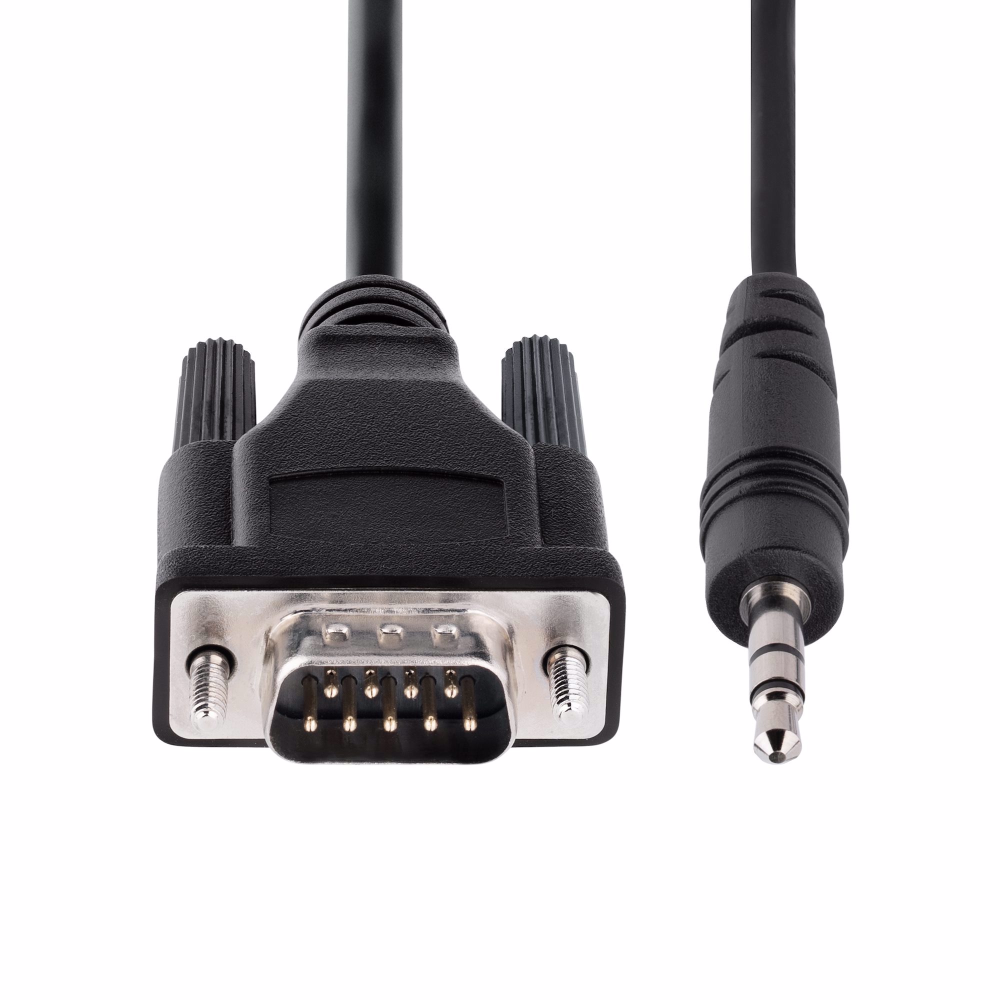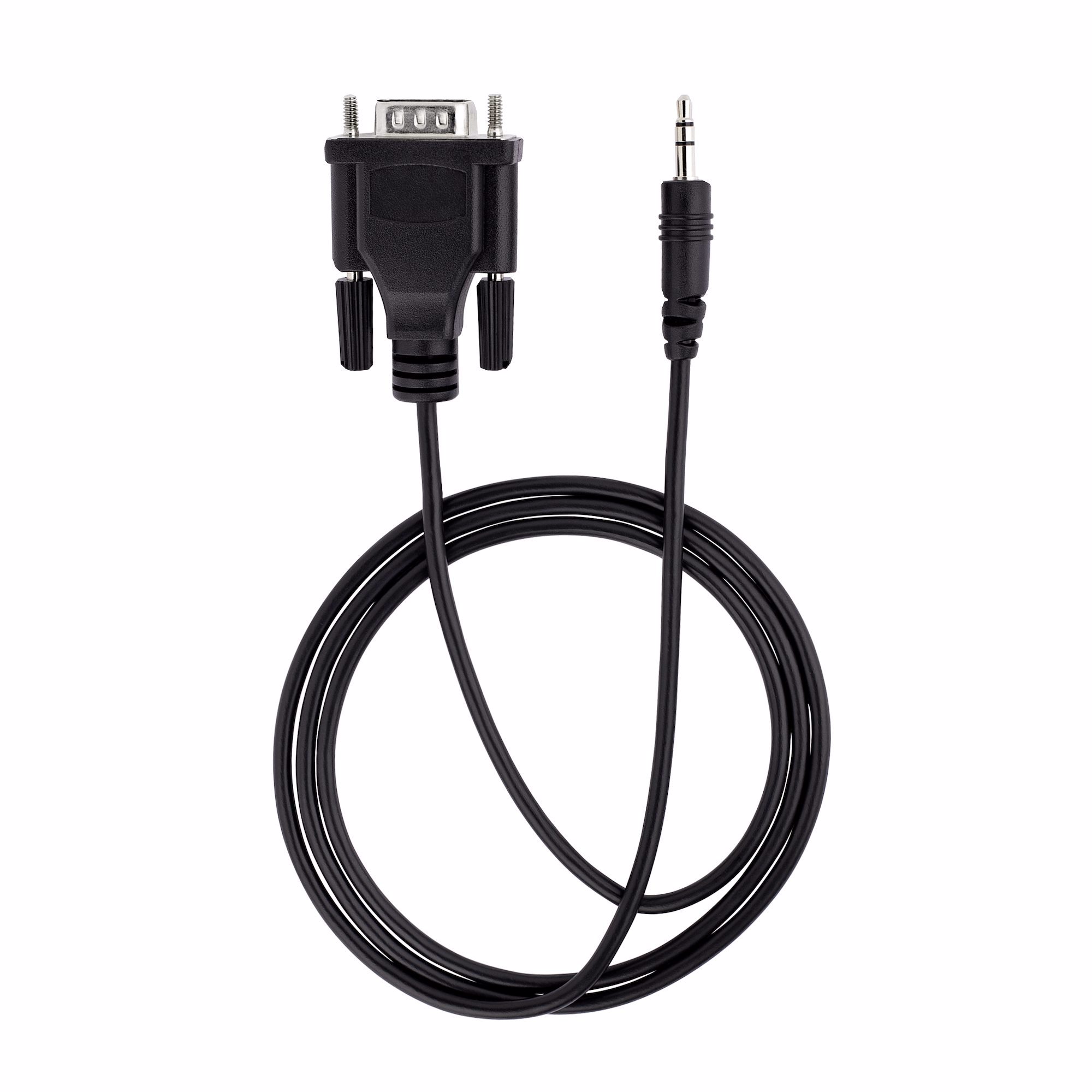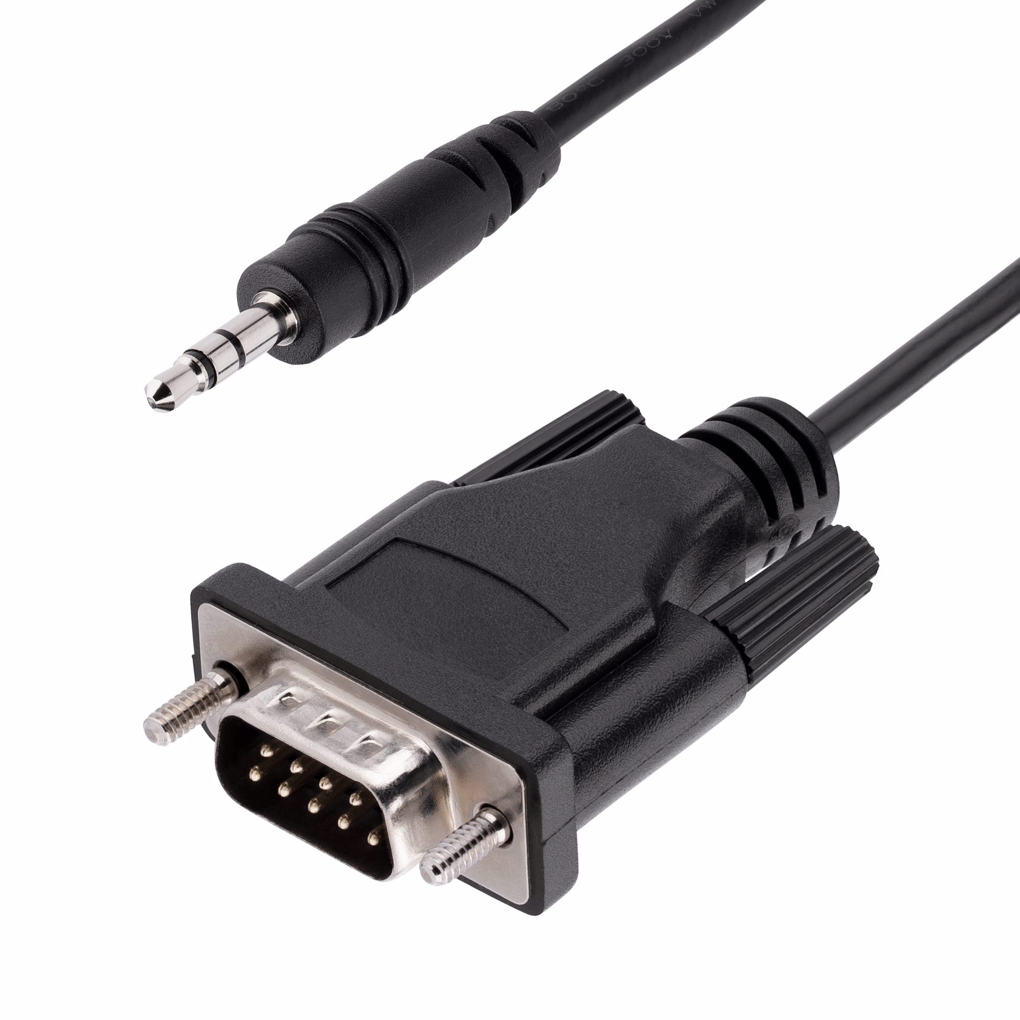 This serial cable features male DB-9 and 3.5mm connectors. It enables remote serial RS232 calibration of TVs, projectors, and digital signage devices that feature a 3.5mm audio jack.
