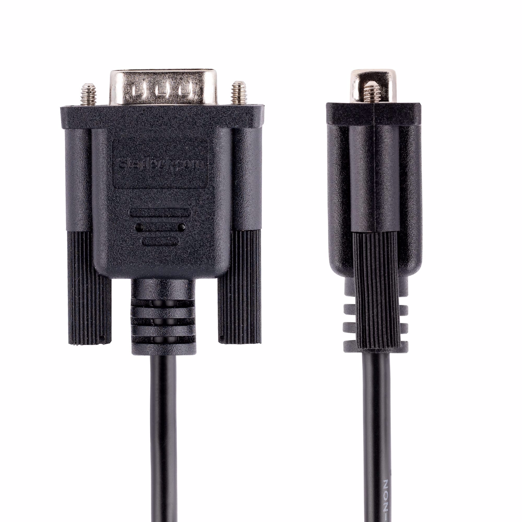 This null modem serial cable features male and female DB9 connectors. It enables a connection between serial devices at a distance of up to 3 meters. The length of the cable allows for flexible serial device setup configuration.
