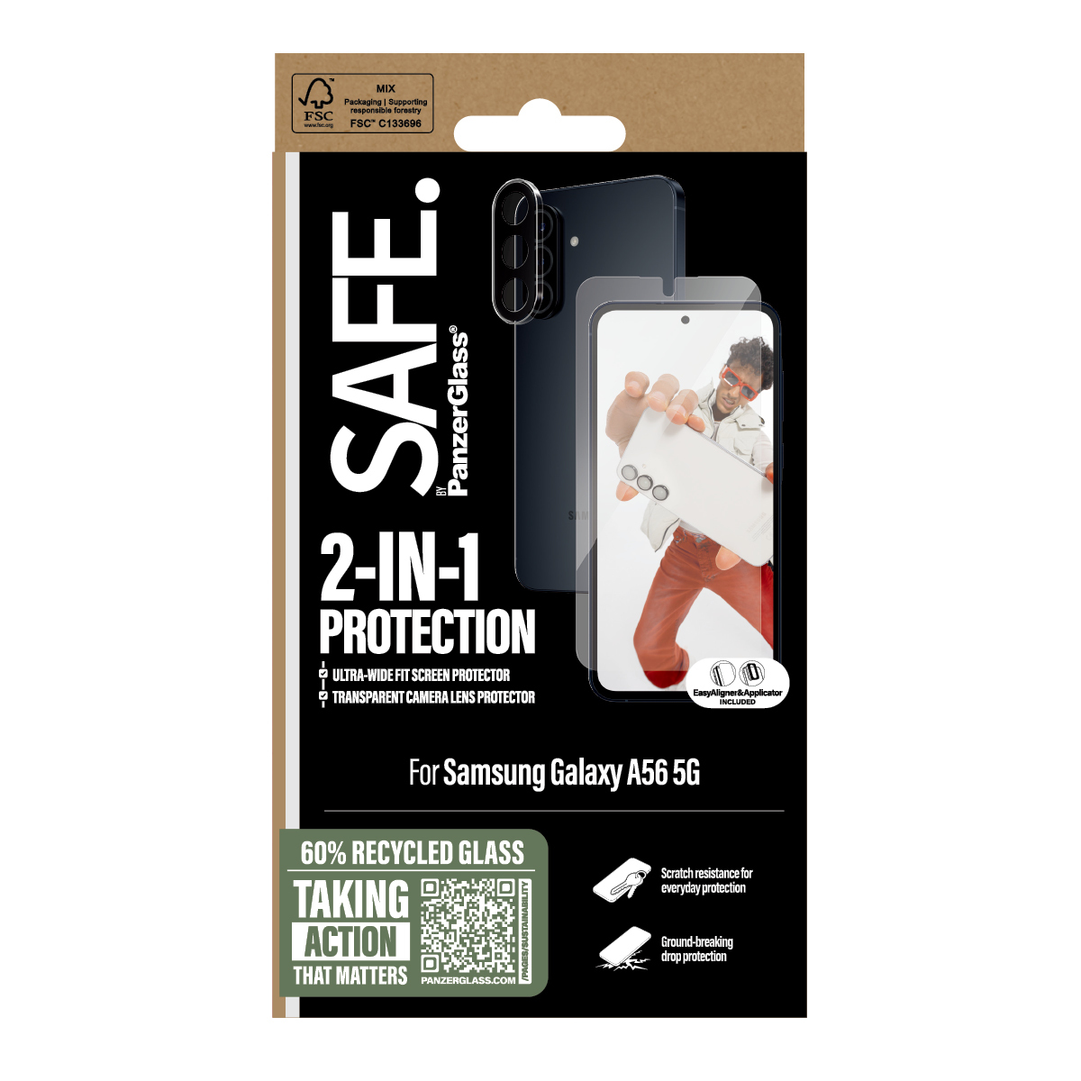 Når du vælger SAFE., gør du det ikke kun for din egen skyld, men også for alle dem, der kan få glæde af din telefon efter dig! Ved at passe godt på din elskede mobil kan du nemlig give den et andet, tredje og nogle gange fjerde liv hos en anden, som vil elske den lige så højt som dig. Det er ren telefonkærlighed. Det er ren telefonkærlighed – og én måde at bidrage til mere bæredygtig fremtid på! En anden er at bruge emballage, der er bedre for miljøet: Derfor leveres den her 2-i-1-beskyttelsespakke i en FSC®️-mærket æske, der kan genanvendes.