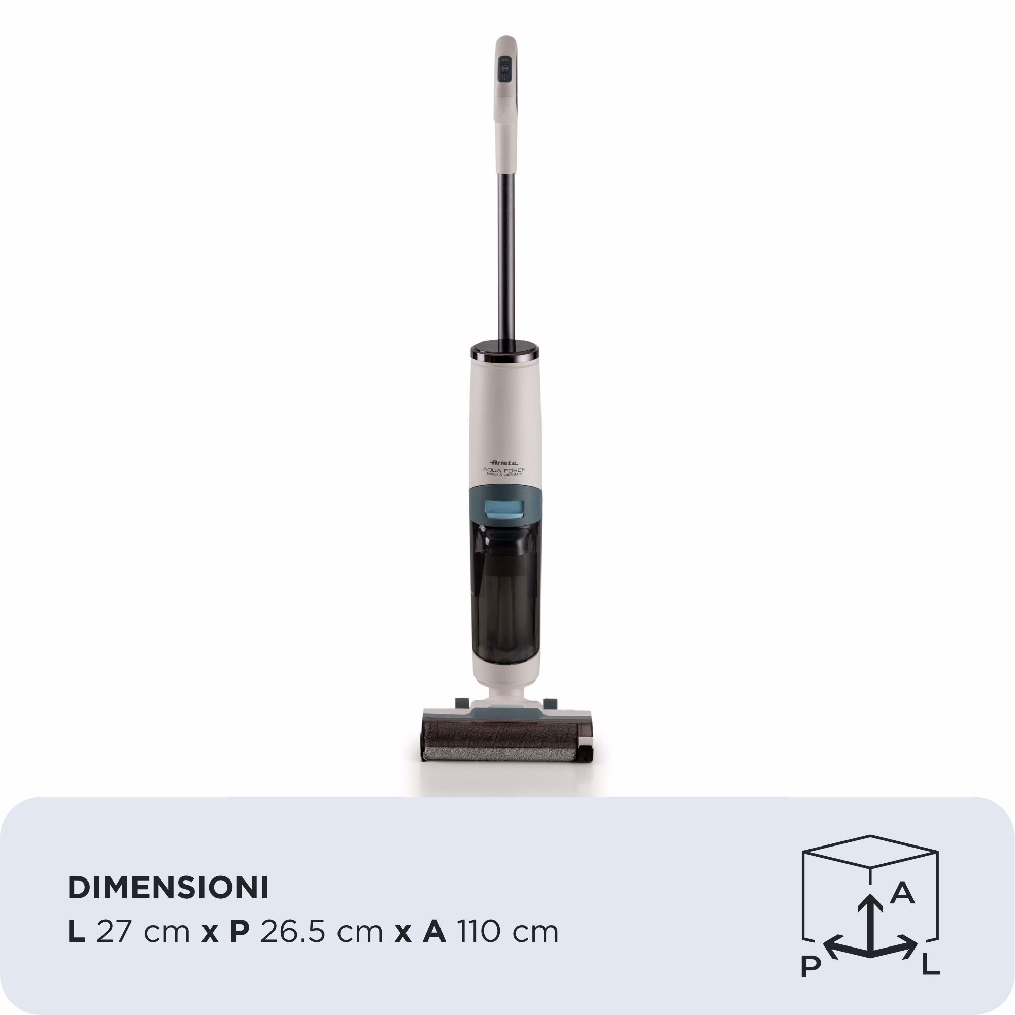 It's not just a cordless vacuum and floor cleaner: Aqua Force Wash & Vacuum is the perfect everyday cleaning ally to take care of your house. Aqua Force Wash & Vacuum simultaneously vacuums and cleans dry and wet dirt on all hard floors: tile, parquet, marble, laminate, terracotta. Thanks to the powerful suction force and integrated technology, surfaces will be dry within minutes after each pass, with no streaks or residual moisture.It is possible to choose between 3 modes:ECO with water: for daily cleaning, providing an autonomy of about 35 minutes;MAX with water: for the most stubborn dirt and provides an autonomy of 25 minutes;Suction only: for quick needs.Aqua Force Wash & Vacuum features a self-propulsion system that allows it to glide across the floor, and, thanks to its cordless design, cleaning becomes smoother and less tiring.Aqua Force Wash & Vacuum has two separate tanks: one for clean water (700 ml), where a specific detergent can be added, and one for dirty water (500 ml). It also features an integrated HEPA filter. With 2 water indicators on the digital display, Aqua Force Wash & Vacuum will alert you if clean water is missing or if the dirty water tank is full and needs to be emptied. The user-friendly digital display indicates suction mode, battery life, water indicator, self-cleaning, tangled roller, and spin drying. The brush, designed specifically for edge cleaning, stays clean, sanitized, and ready to use at all times thanks to the roller's self-cleaning system and centrifugal function.It will become your cleaning ally, and you won't be able to live without it!