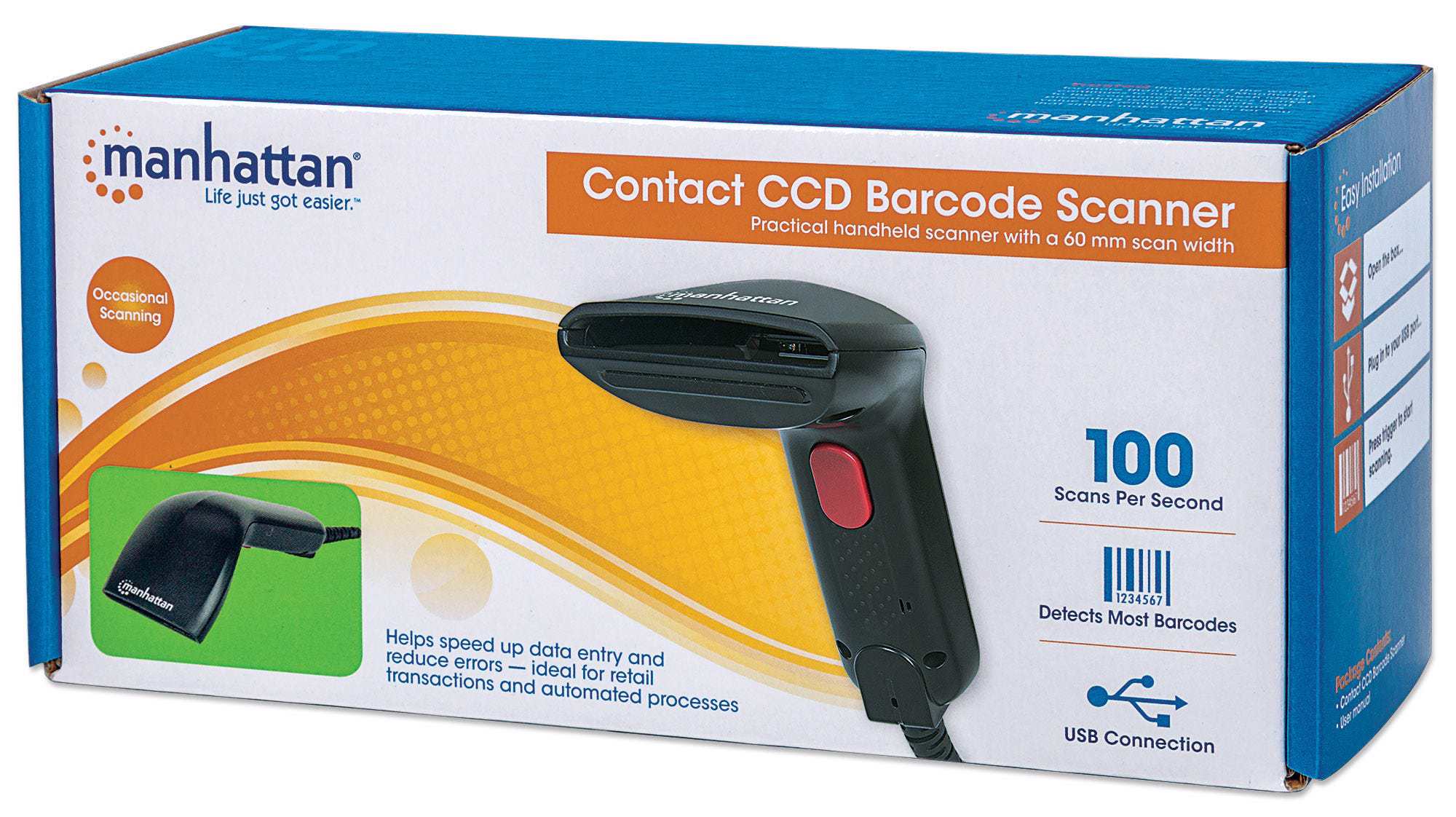Manhattan CCD Contact Barcode Scanners deliver high-quality scanning for a wide range of data collection functions to help improve routine transactions, automate paper-based processes and increase productivity. The CCD (charged-coupled device) scan engine features no moving parts for years of reliable service reading popular barcodes, including UPC, EAN, ASCII and GS1 DataBar. Easy to implement and simple to use, a built-in keyboard wedge decoder sends scanned data to an active application, where it appears as if it were manually typed or directly keyed into the computer. Its USB cable interface integrates with most PCs without an external power supply. With a scan rate of 100 scans per second and an accurate read range of up to 60 mm (2.4 in.), this model offers a practical daily scanning solution for point-of-sale, shipping, warehousing, office and industrial applications to minimize manual data entry, speed transactions and reduce errors.