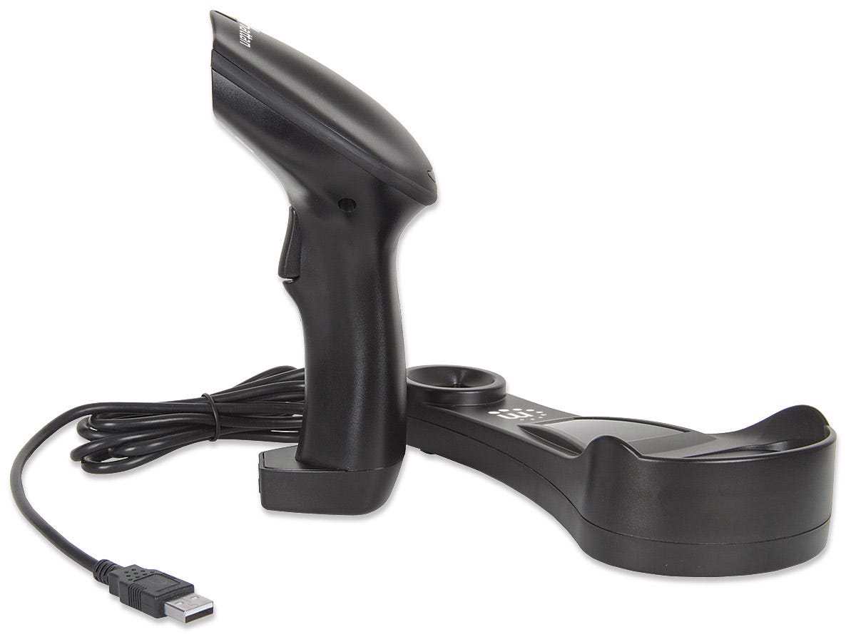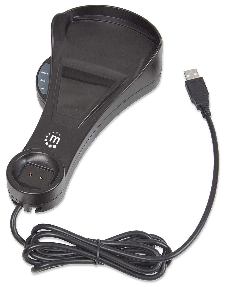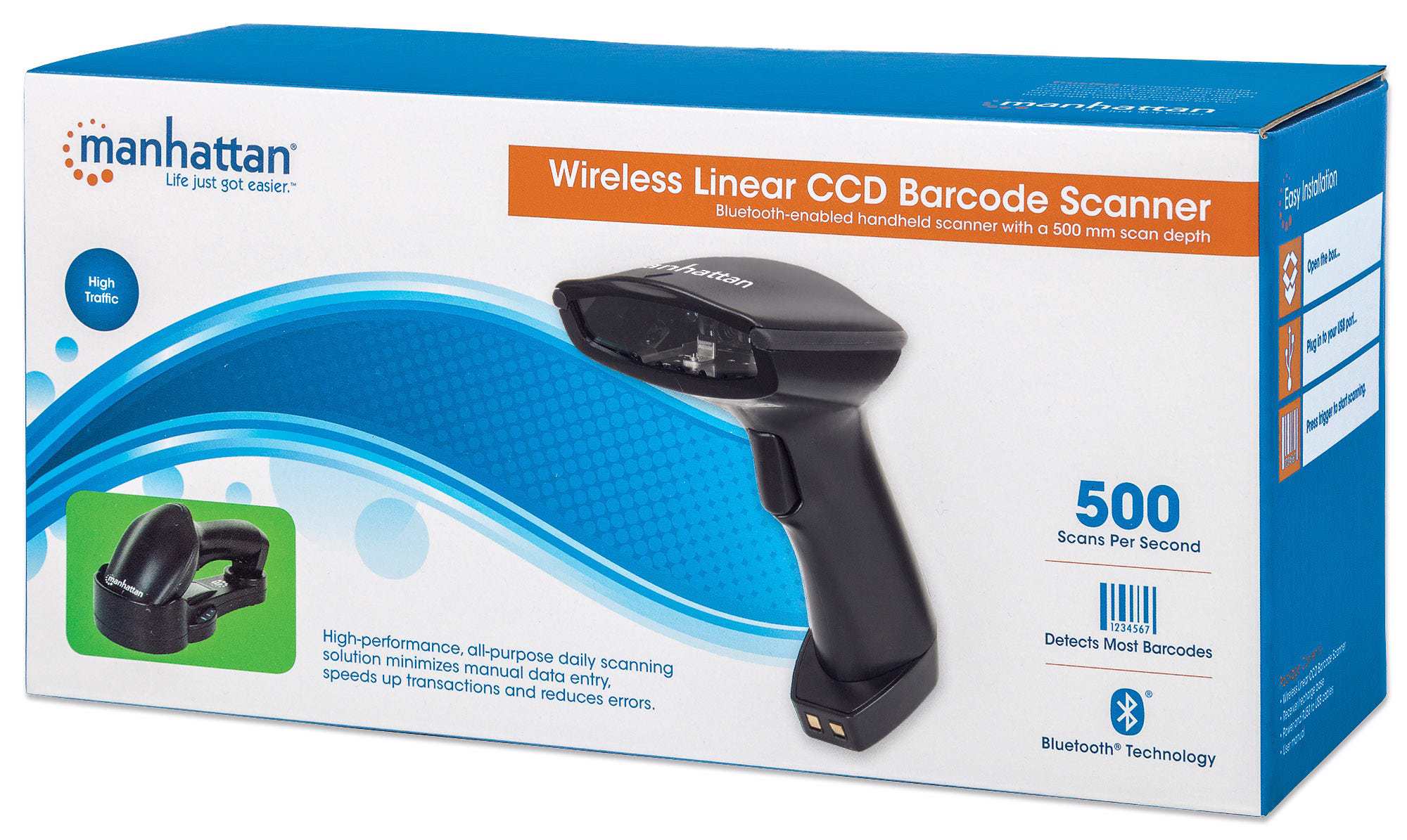 Manhattan Wireless CCD Long-Range Contact Barcode Scanners deliver high-quality scanning for a wide range of data collection functions to help improve routine transactions, automate paper-based processes and increase productivity. When out of range of the paired Bluetooth device, the handset is able to store up to 3,000 scans. The CCD (charge-coupled device) scan engine features no moving parts for years of reliable service reading popular barcodes, including UPC, EAN, ASCII and GS1 DataBar. Easy to implement and simple to use, a built-in keyboard wedge decoder sends scanned data to an active application, where it appears as if it were manually typed or directly keyed into the computer. Its Bluetooth technology provides a convenient operation range of up to 80 m (264 ft.) from the recharging base. With a scan rate of 500 scans per second and an accurate read range of up to 500 mm (20 in.), this model offers a high-performance, all-purpose daily scanning solution for point-of-sale, shipping, warehousing, office and industrial applications to minimize manual data entry, speed transactions and reduce errors.