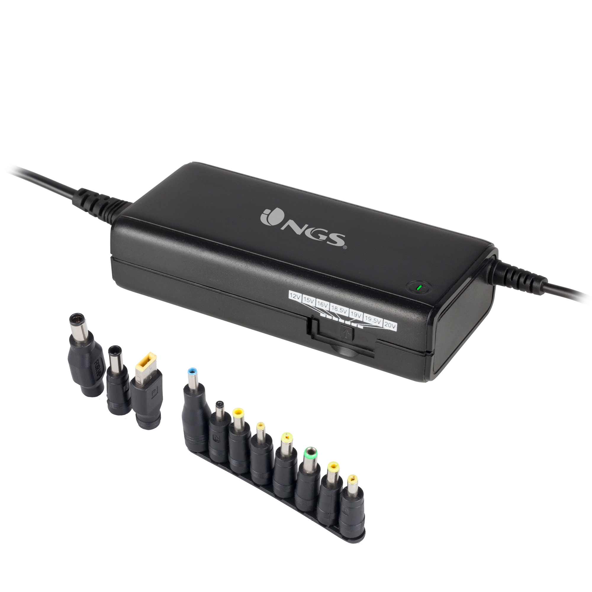 NGS Ban includes a special plug that provides different voltages with its selector, compatible with laptops that require 12-20 Volt and 90 Watt power or less.