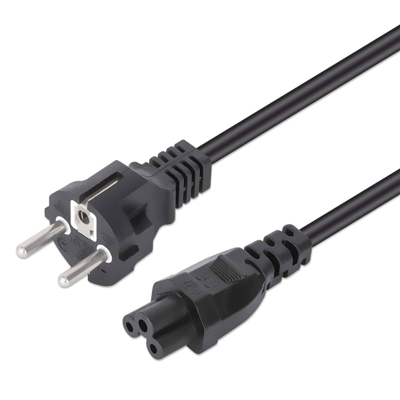 The Manhattan EU Power Cable CEE 7/7 to C5 (sometimes popularly called the Mickey Mouse connector) easily connects and extends the reach between a European two-prong power outlet and a laptop power adapter, printer or other compatible device that receives power through a three-slot C6 "cloverleaf" socket. Ideal for new systems or replacement applications, this power cable is engineered and built from quality materials that meet current safety standards to deliver and maintain reliable connections. Fully molded boots with strain relief, a durable PVC jacket and heavy-duty construction enable this power cable to transmit dependable power where and when needed with maximum electrical conductivity.