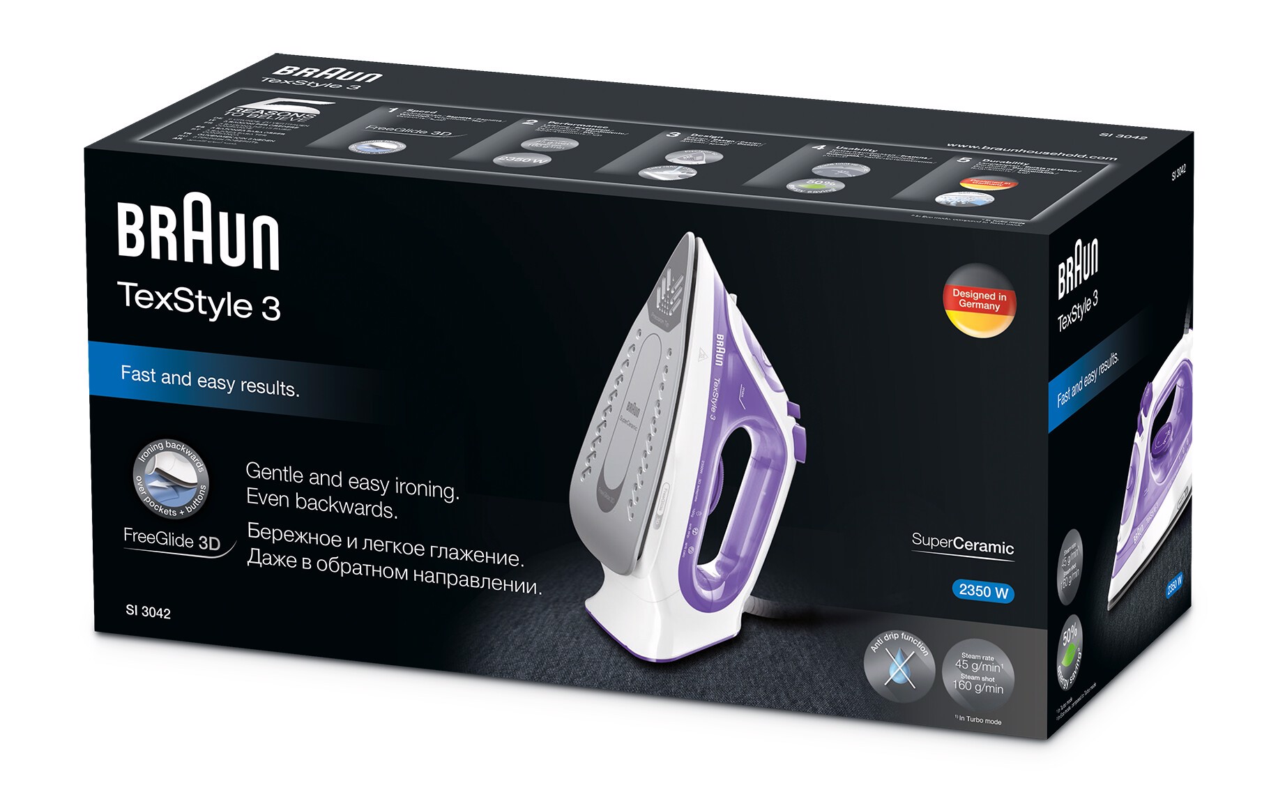 Braun TexStyle 3 SI3042VI Dampstrygejern Keramisk strygesål 2350 W Lilla, Sølv, Hvid
