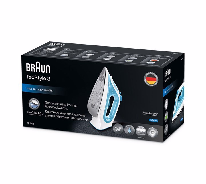 Braun TexStyle 3 Steam Iron SI 3053 Blue, Keramisk strygesål, 2 m, 170 g/min, Blå, 45 g/min, 0,27 L
