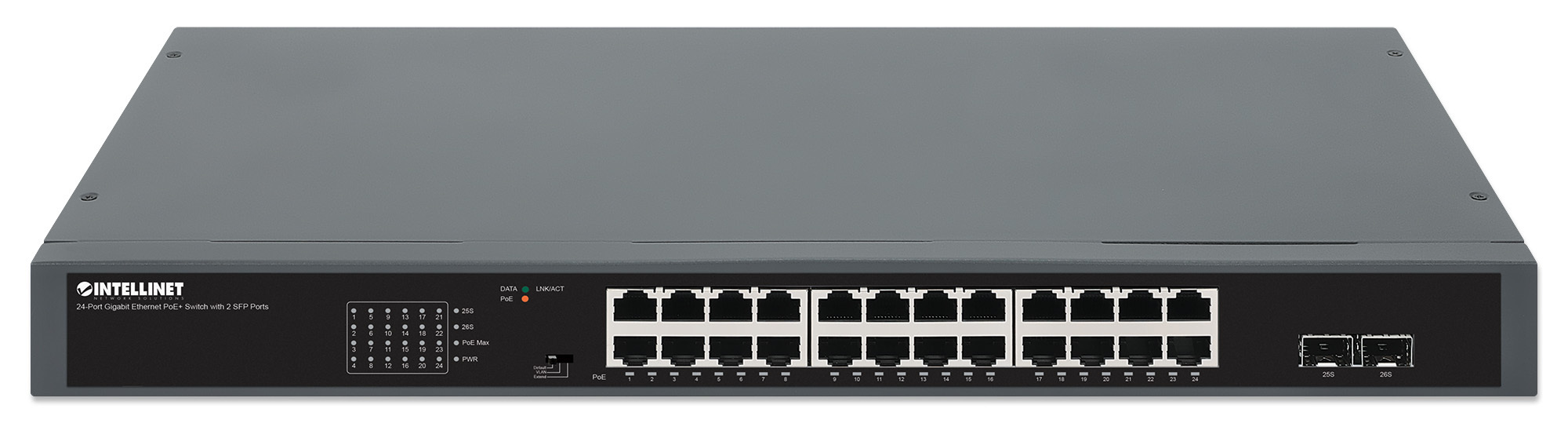 The Intellinet Network Solutions 24-Port Gigabit Ethernet PoE+ Switch with 2 SFP Ports passes both data and electrical power to a number of PoE-compatible devices via standard Cat5e or Cat6 network cables. Equipped with 24 Gigabit Ethernet ports, this switch can power wireless LAN access points and bridges, VoIP phones, IP video cameras and more while delivering network speeds up to 1,000 Mbps.