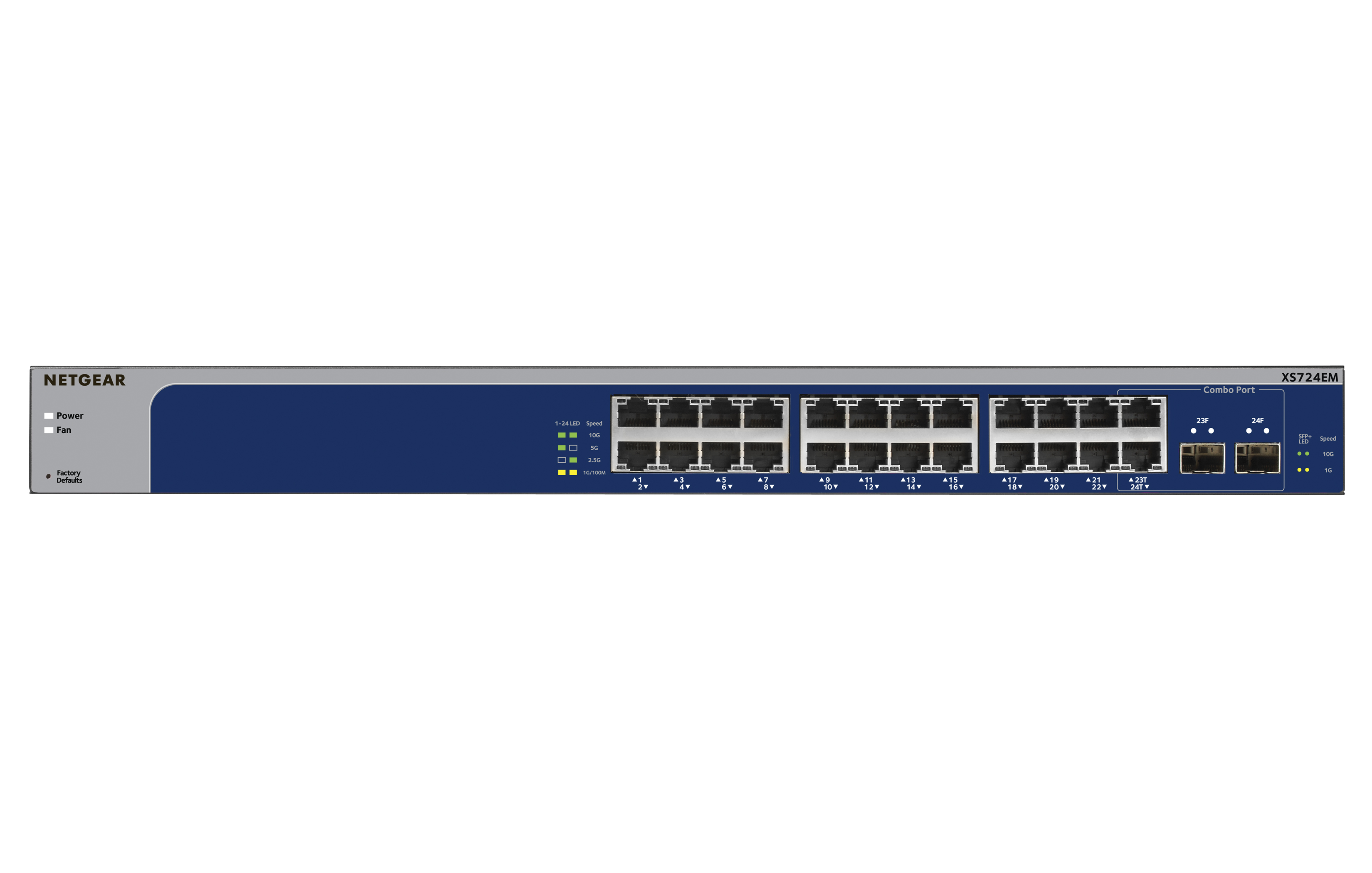 Each port automatically detects which speed is needed by the connected device and provides the adequate speed. As opposed to regular 10-Gigabit switches that will only provide 1-Gigabit connectivity to any device that require less than 10-Gigabit, the XS512EM and XS724EM gives the exact speed required, no downgrade. Also, the new NETGEAR Multi-speed switch ports can be connected with regular Cat5E Ethernet cables, without the need to upgrade to Cat6/Cat6A wiring, therefore reducing wiring costs and hassle