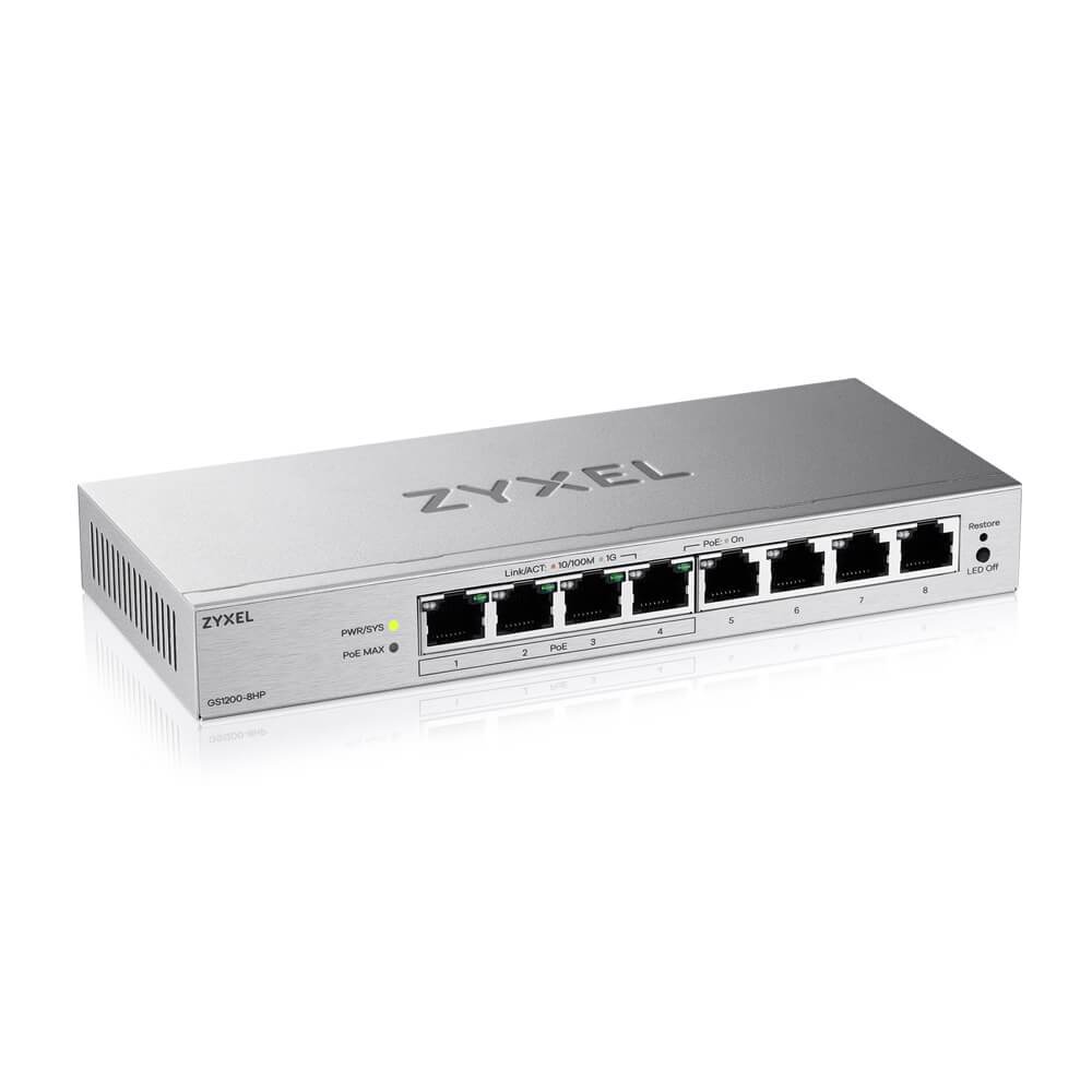 There are five models for GS1200v3 series, coming with non-PoE (GS1200-5/8) to connect to devices including PCs, NAS, and print servers, PoE capable (GS1200-5HP/8HP) to provide power to IP CAM, wall mounted AP and PoE standard devices, and fiber uplink (GS1200-10) for easily deployment in hallways to connect network devices on the same floor and link them back to the core network.
