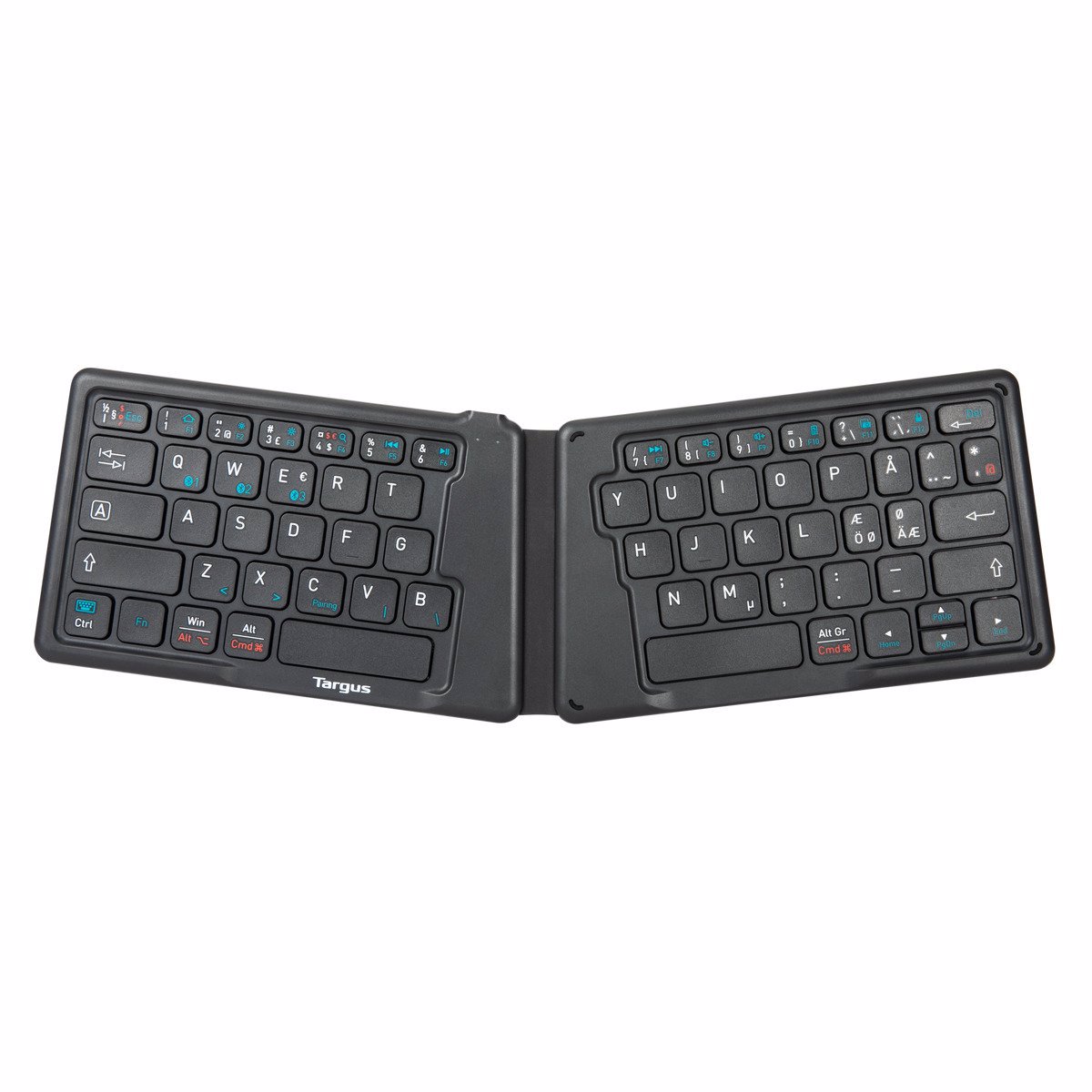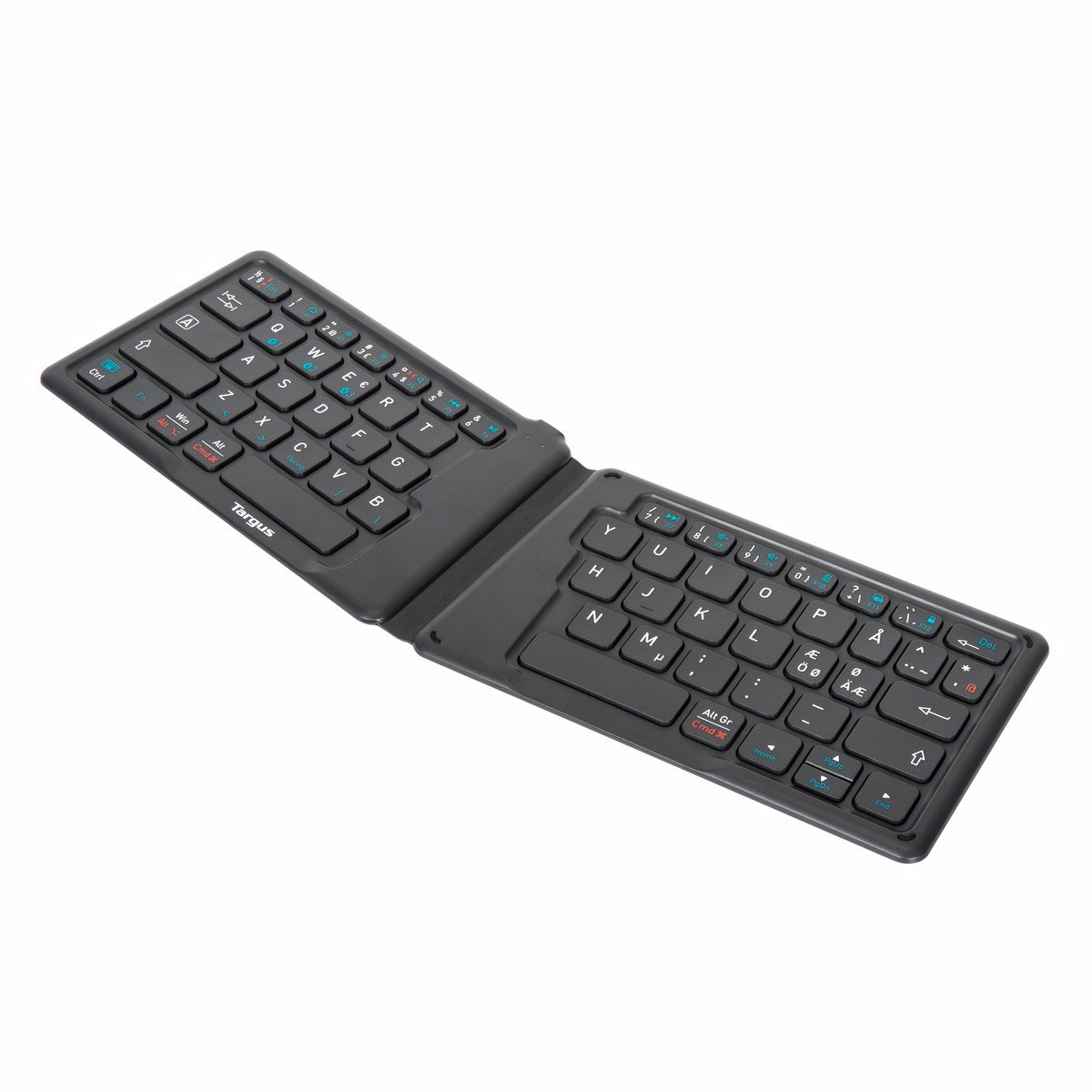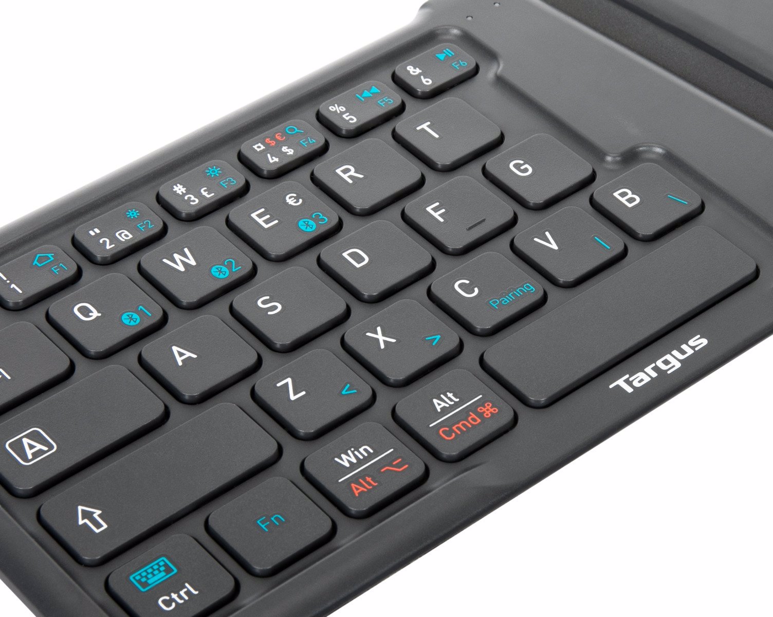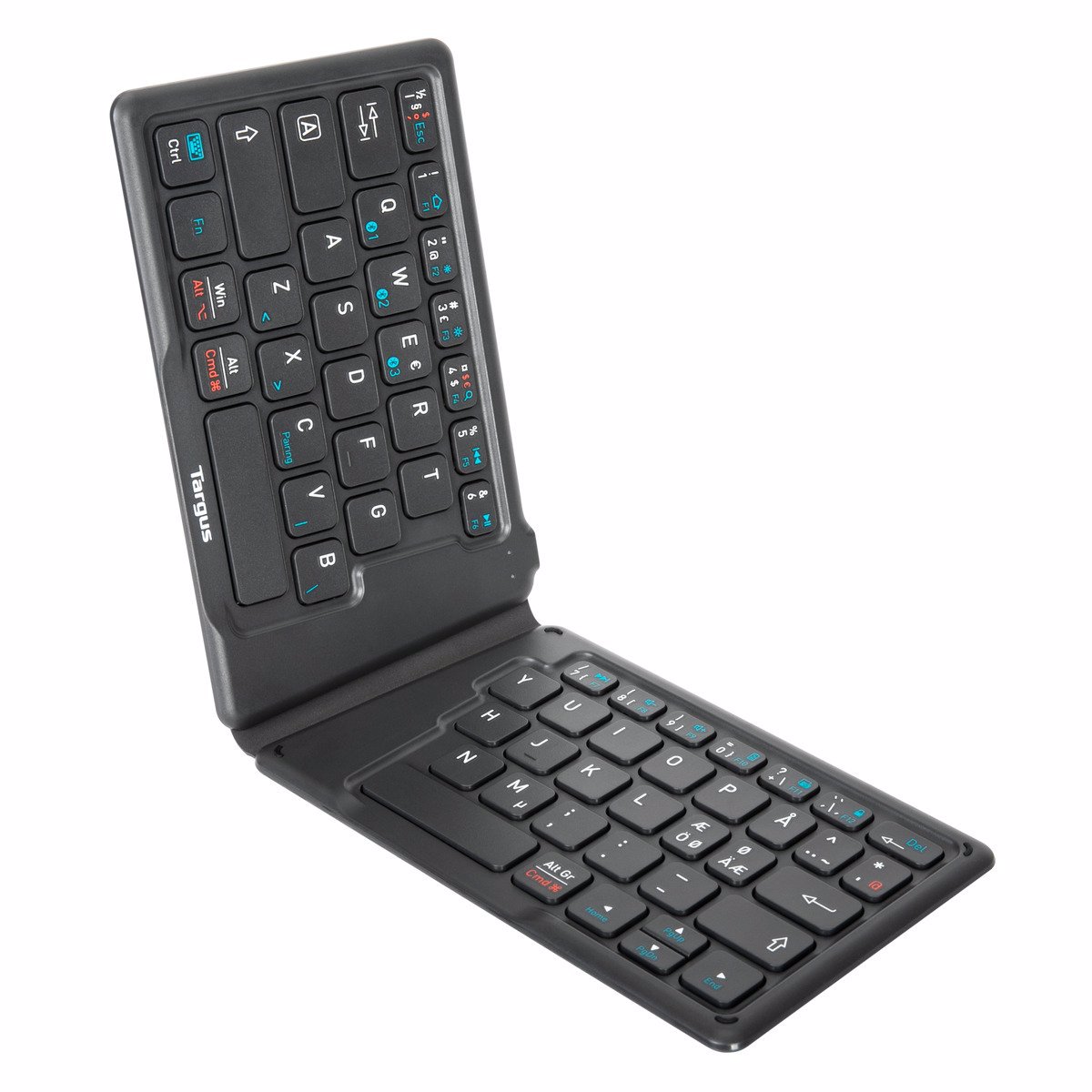 Targus Folding Ergo French-language Keyboard infused with antimicrobial protection. An ergonomic pocket-sized keyboard, offering universal compatibility, it pairs and stores up to three devices in its memory. With a battery life of 36 hours you can type and create in comfort, wherever you are.