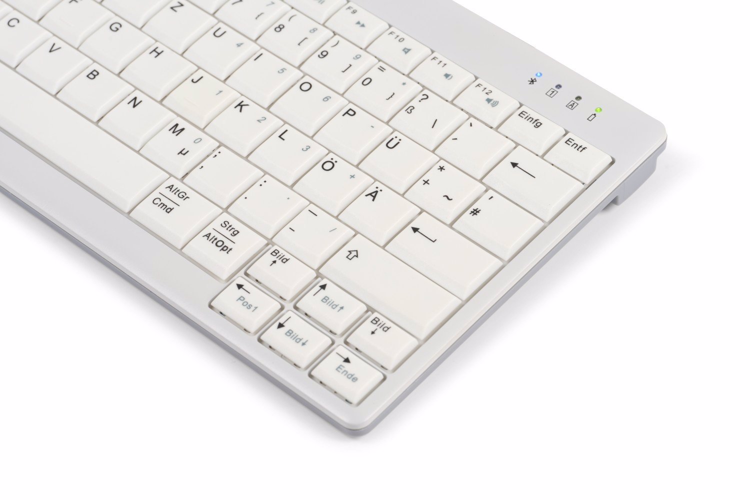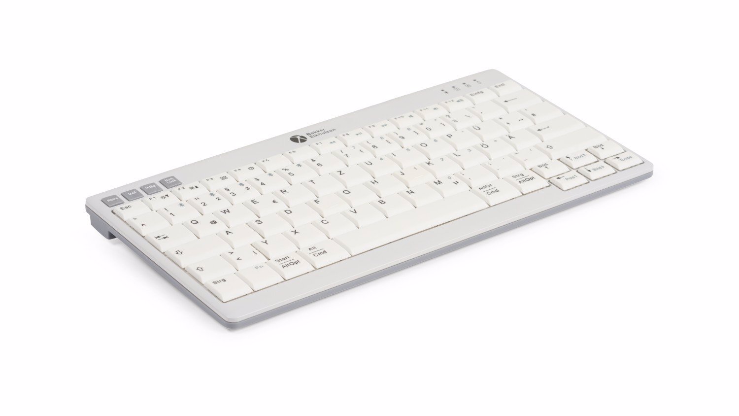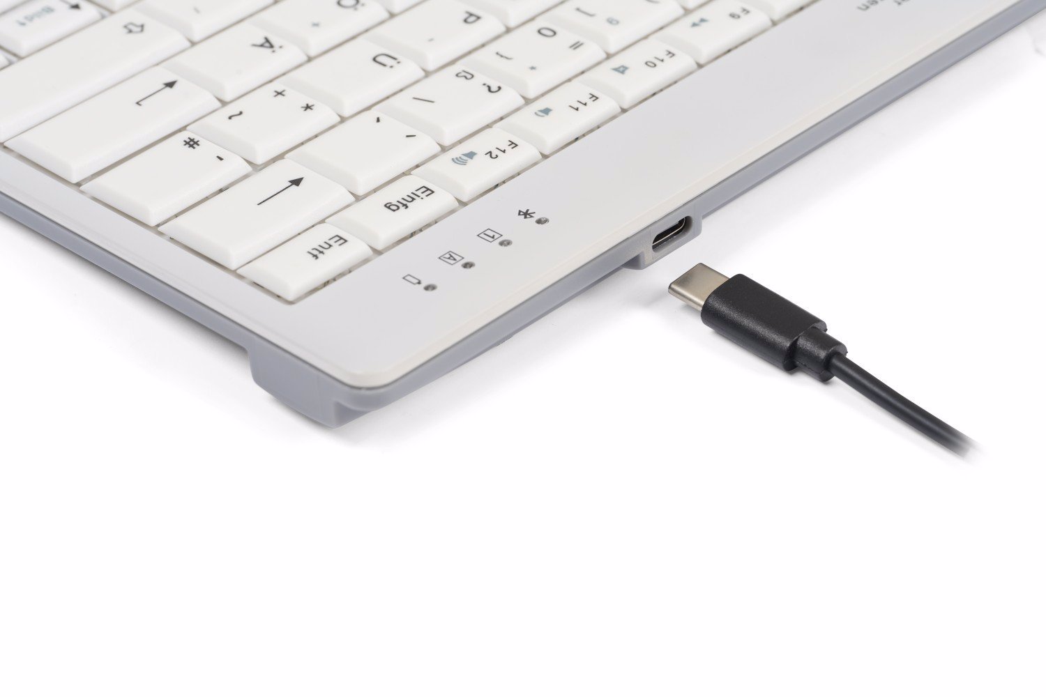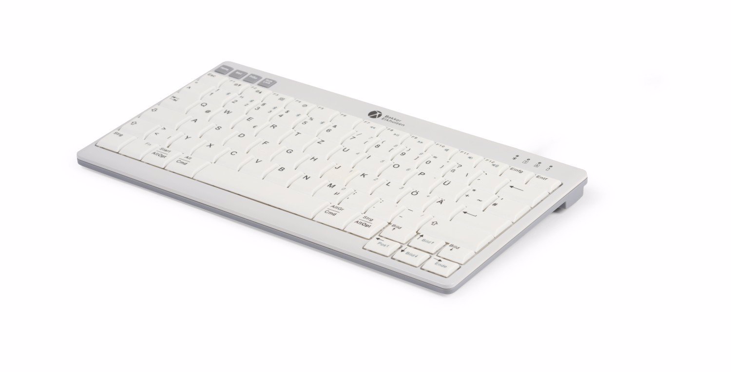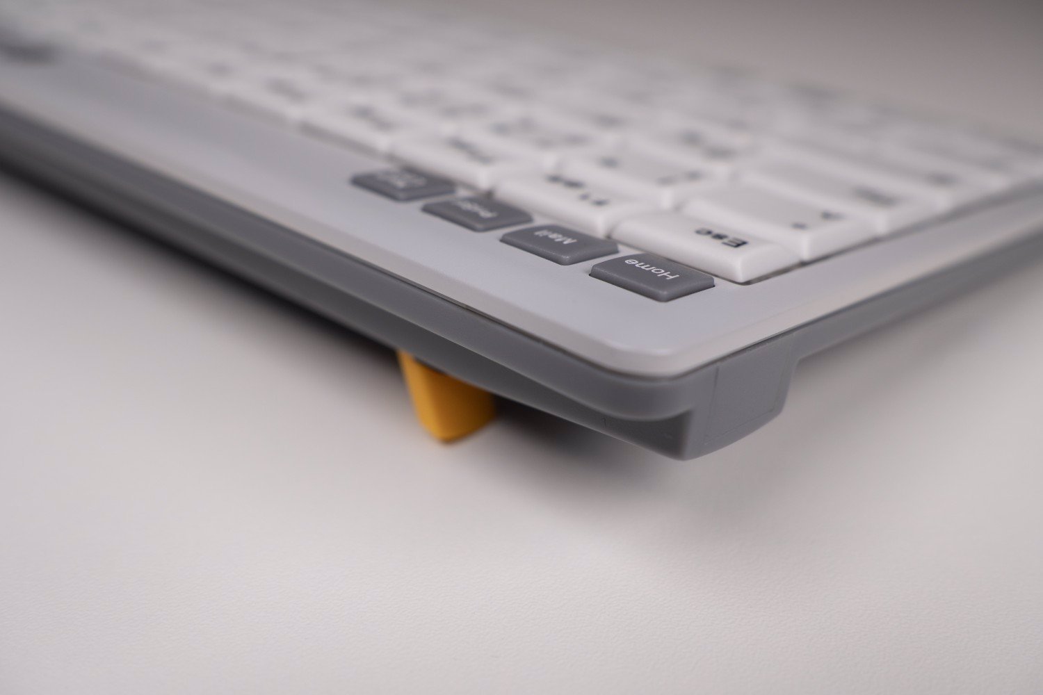 The UltraBoard 950 V2 Wireless Bluetooth features a matt surface with dark letters on a light background, reducing reflections and improving readability. The fold-out feet provide an optimal viewing angle for those who do not use the ten-finger typing system. The stylish design enhances usability and productivity.