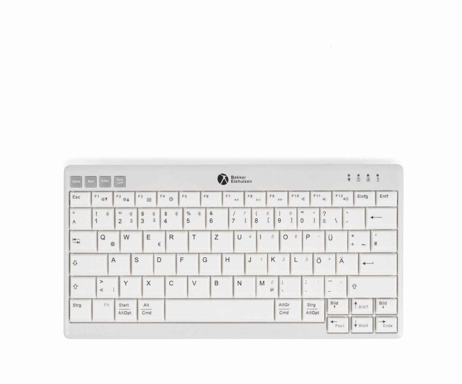 The UltraBoard 950 V2 Wireless Bluetooth keyboard is designed for portability and ergonomic efficiency. Its compact size makes it easy to carry and promotes healthier working habits. The keyboard features a scissor mechanism, 19mm key centre distance, and concave keys with dark lettering on a white background, ensuring precise and comfortable typing. Additional features include hotkeys, integrated multimedia keys, and status LEDs for a more efficient workflow.