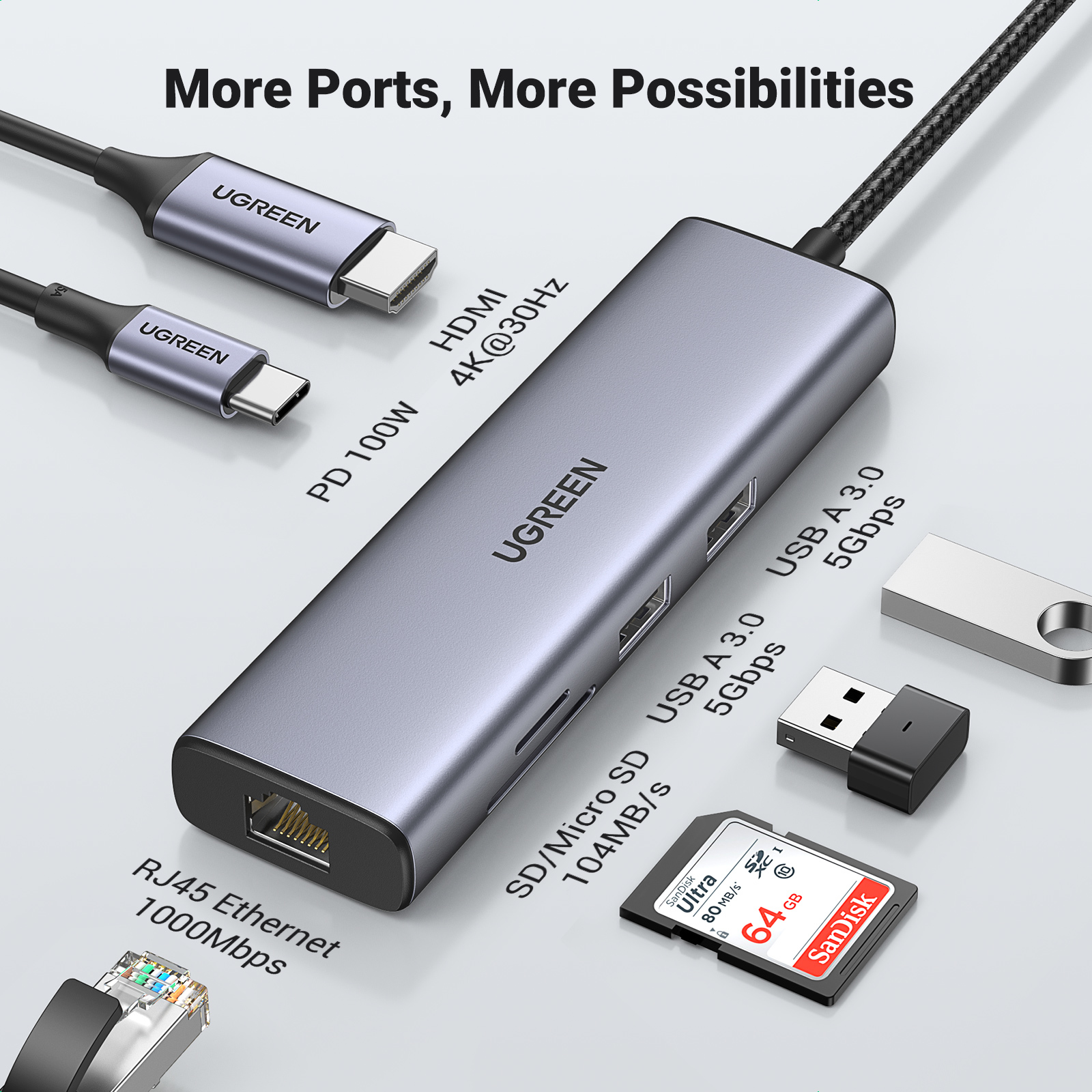 UGREEN USB C Hub Ethernet 4K HDMI 100W Power Delivery 7-in-1 USB C Multiport Adapter 2 USB 3.0 5Gbps Ports, SD/TF Card Reader, for MacBook, iPad Pro, Surface Pro, iMac, Mini M1, XPS, etc