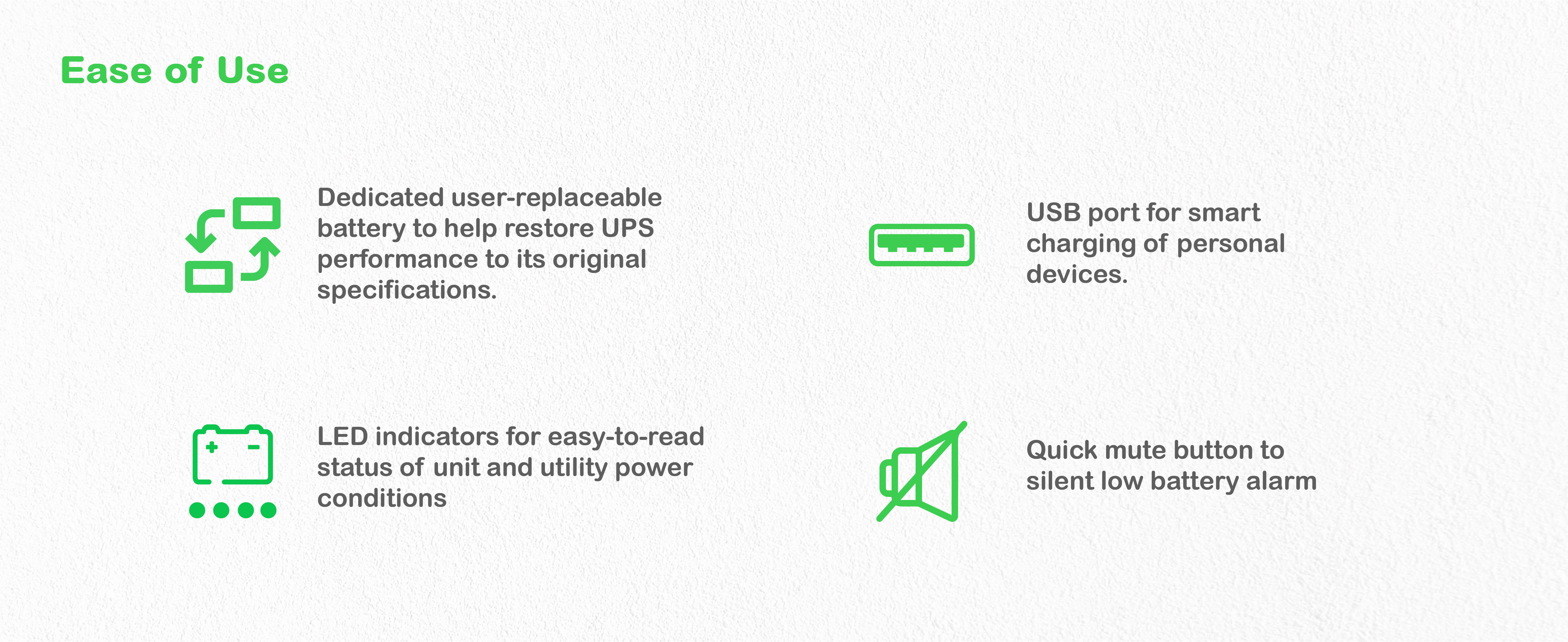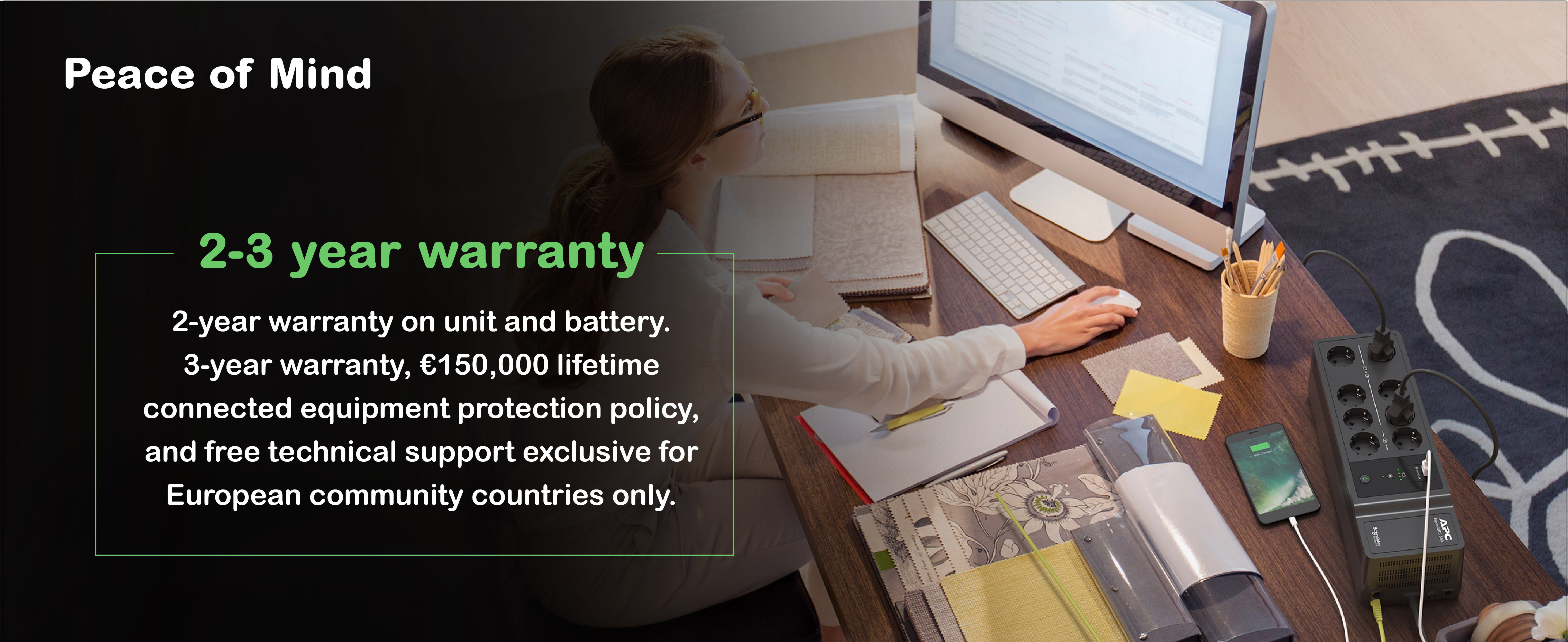 This APC Back-UPS offers power and surge protection for wireless networks, computers, gaming consoles and other electronics in your home or business. The 500VA floor/wall mount UPS has 8 total outlets, 6 of which are battery back up and surge protection, and 2 that are surge protection only. It has a surge energy rating of 310 Joules. It has one USB port for smart charging of personal devices. This UPS has a 2-year warranty on unit and battery. 3-year warranty, €100,000 lifetime connected equipment protection policy, and free technical support exclusive for European community countries only. It is compatible with a dedicated user-replaceable battery, and the APC replacement battery cartridge helps restore UPS performance to the original specifications.