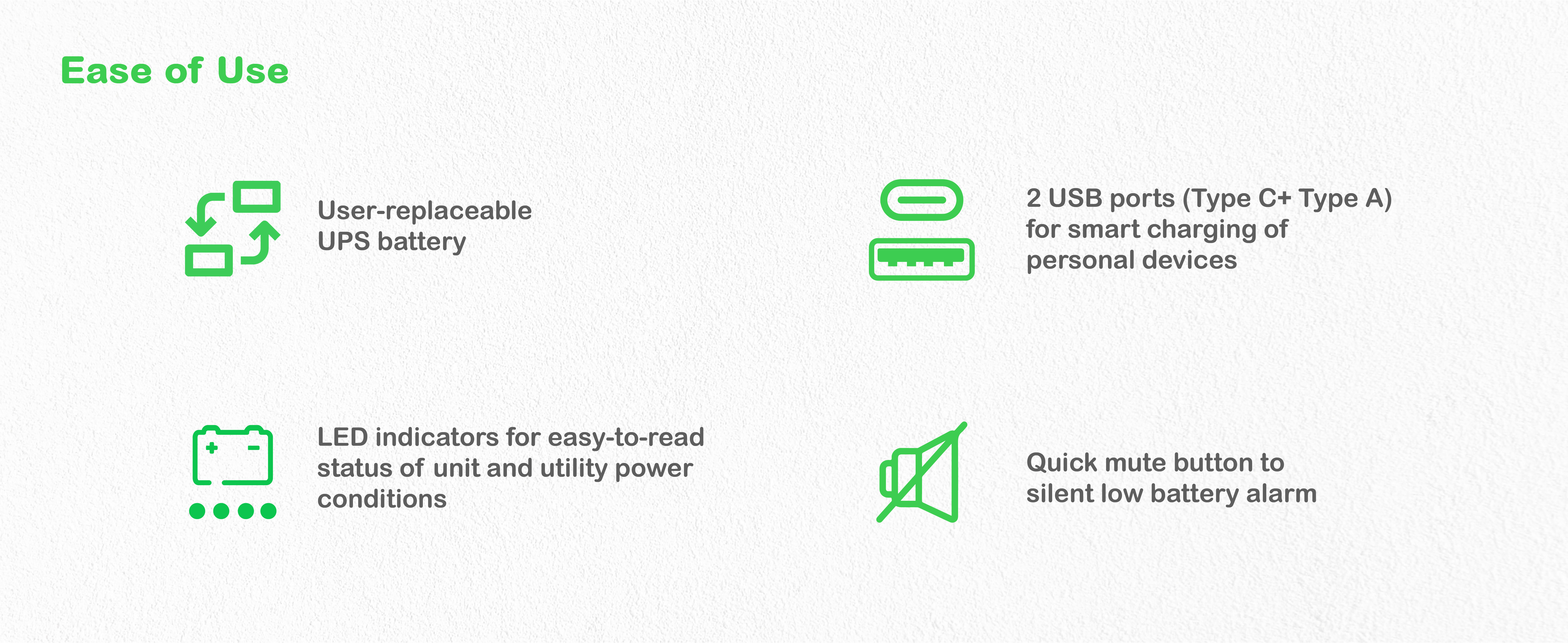 This APC Back-UPS offers power and surge protection for wireless networks, computers, gaming consoles and other electronics in your home or business. The 1050VA floor/wall mount UPS has 8 total outlets, 6 of which are battery back up and surge protection, and 2 that are surge protection only. It has a surge energy rating of 310 Joules. It has 2 USB Ports (Type A + C) for smart charging of personal devices. This UPS has a 2-year warranty on unit and battery. 3-year warranty, €100,000 lifetime connected equipment protection policy, and free technical support exclusive for European community countries only. It is compatible with a dedicated user-replaceable battery, and the APC replacement battery cartridge helps restore UPS performance to the original specifications.