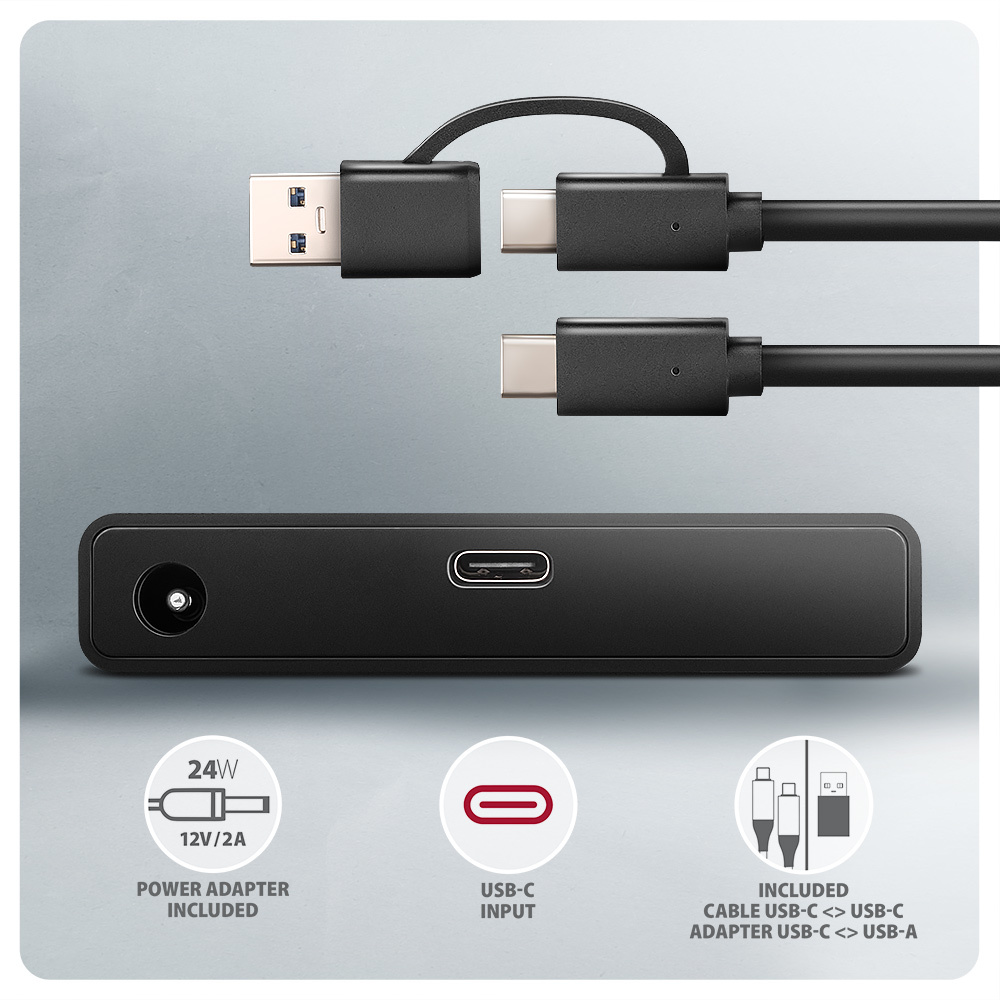 In the package you will find a USB-C <-> USB-C cable 60 cm with a fixed USB-C -> USB-A reduction. This solution enhances the versatility of the adapter, so you can connect it to any USB port on your computer, whether it's a double-sided USB-C connector or a traditional USB-A connector. Also included is a 12V/2A (24W) power adapter for powering 3.5" hard drives. The adapter with a 2.5" SSD/HDD just needs to be powered over the USB bus, so there is no need to manipulate the AC adapter.