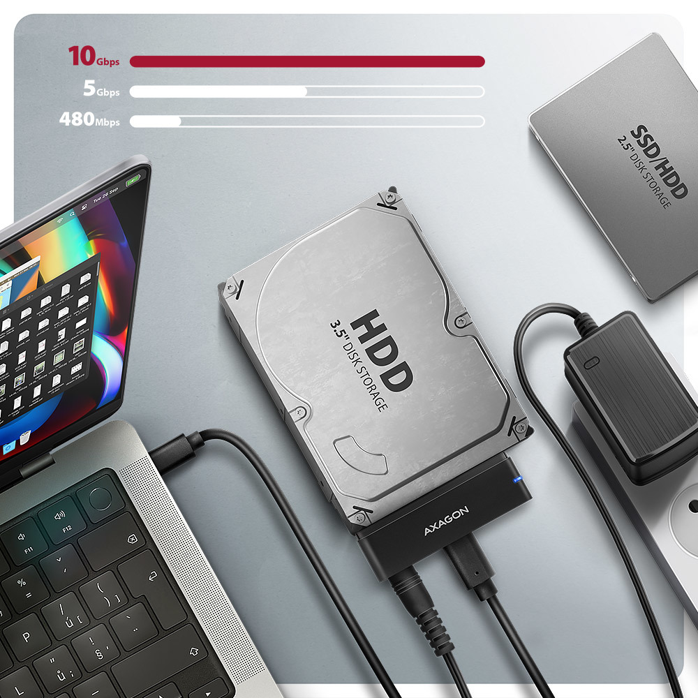 The AXAGON ADSA-FPX FAST PORT X universal adapter with USB-C 10Gbps and SATA 6G interface is designed to easily connect a 2.5" / 3.5" SATA hard drive or SSD to your computer. Thanks to the fast USB 3.2 Gen 2 interface with the transmission rate of up to 10 Gb/s, the speed of 2.5" SSDs is not limited and is approximately 20% faster than USB 3.2 Gen 1 (USB 3.0) adapters or boxes.