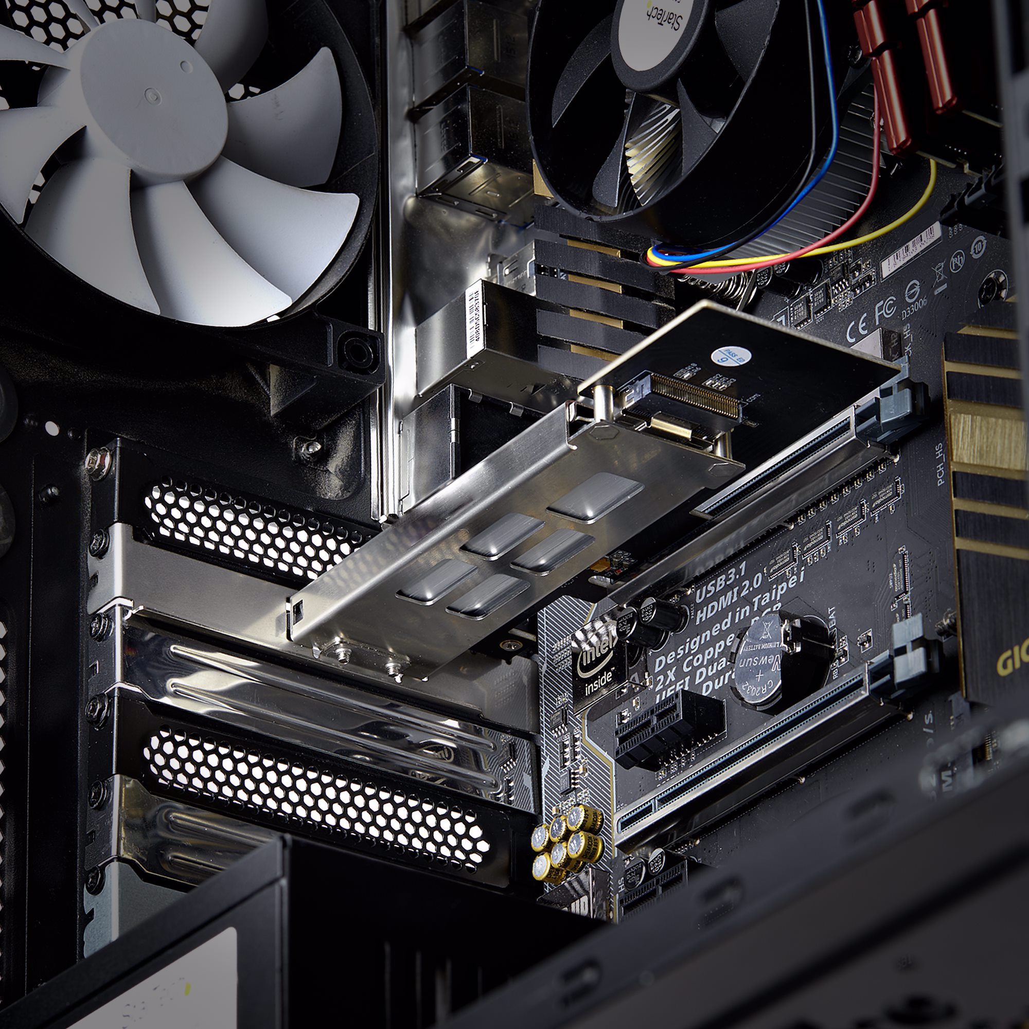 Install into a PCIe x 4 (and up) expansion slot to add a removable and lockable M.2 NVMe drive tray (drive not included)