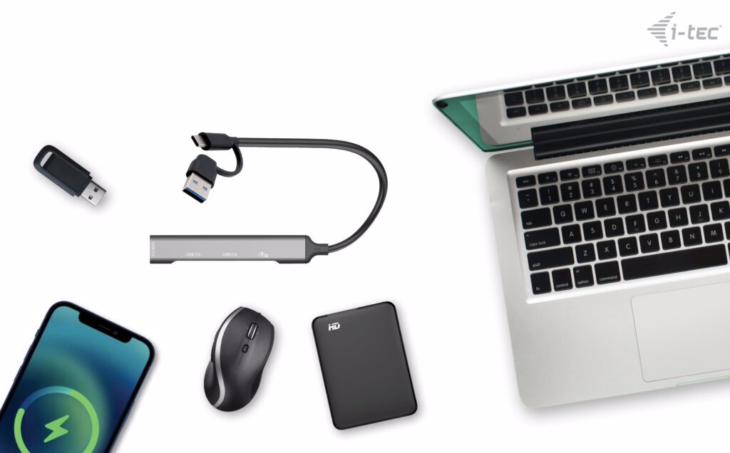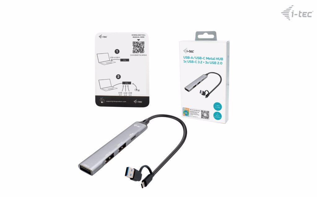 i-tec CAHUBMETALMINI4, USB 3.2 Gen 1 (3.1 Gen 1) Type-A + Type-C, USB 2.0, USB Type-C, 5000 Mbit/s, Sølv, Android, ChromeOS, 100 mm