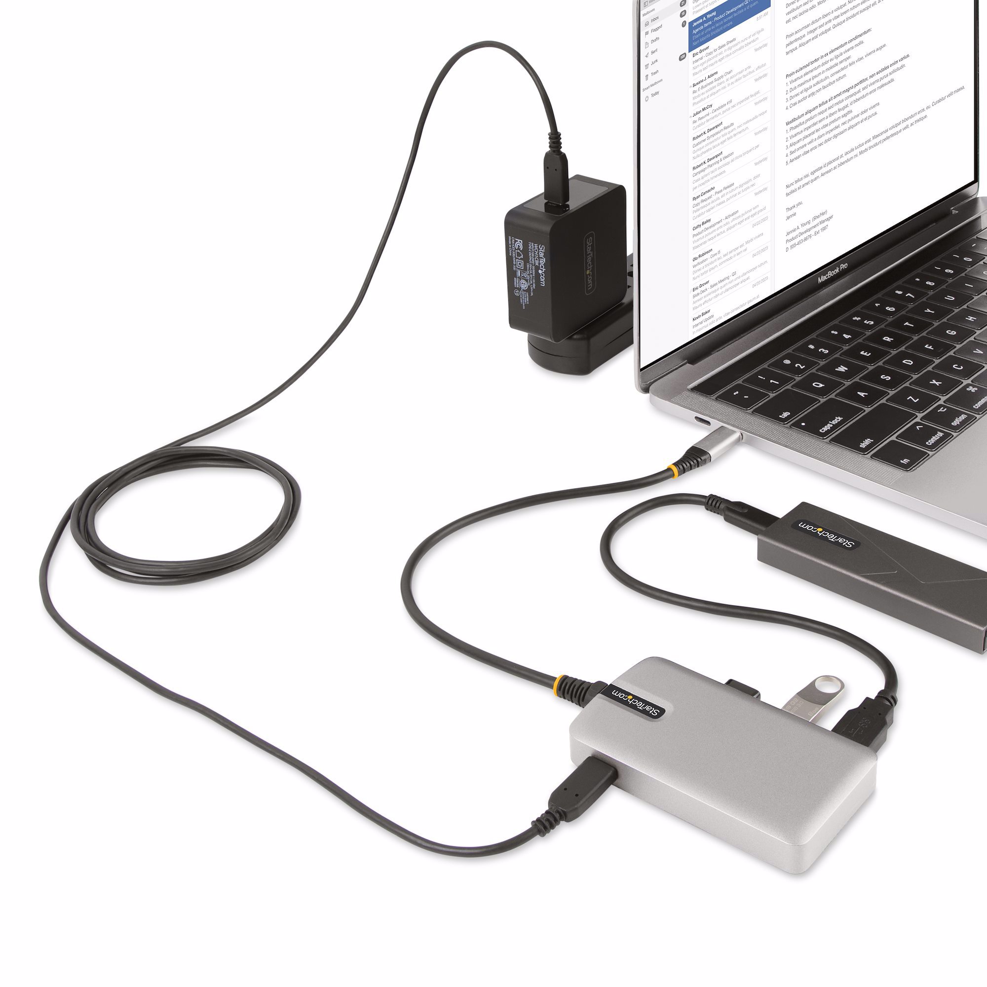 Add four 10Gbps USB ports (3x USB-A and 1x USB-C) to a USB-C enabled laptop while powering and charging the host device with Power Delivery 3.0
