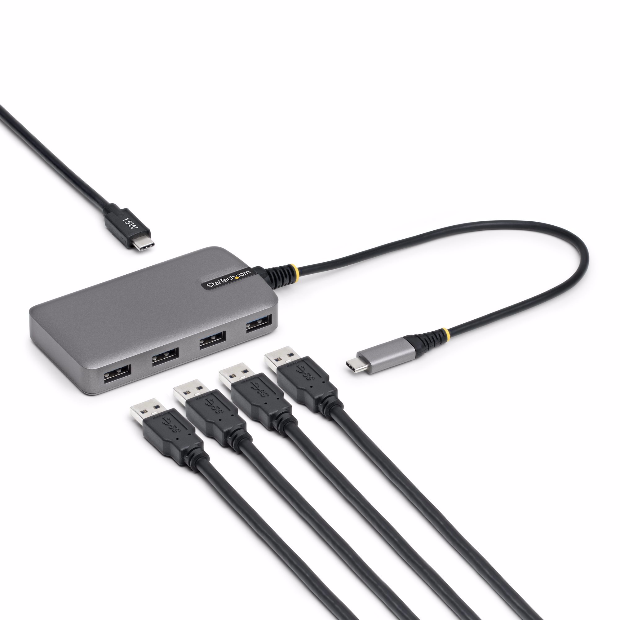 This USB-C Hub adds four USB-A 3.2 Gen 1 (5Gbps) ports to a USB-C enabled desktop or laptop computer. The USB Hub connects to a USB-C port on a computer, using the built-in 1ft. (30cm) host cable. The USB hub is backward compatible with USB 2.0 (480Mbps) devices, ensuring support for a wide range of modern and legacy USB peripherals (e.g., thumb drives, external HDDs/SSDs, HD cameras, mice, keyboards, webcams, and audio headsets). The USB hub is compact in size, facilitating portability when travelling.