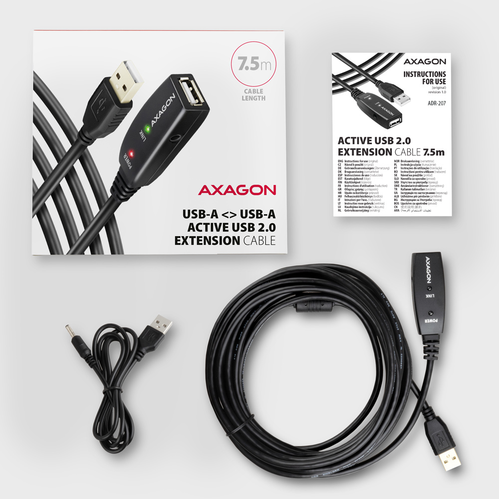 The AXAGON ADR-207 active USB 2.0 extension cable with a length of 7.5 meters is ideal for connecting your computer to USB devices such as a mouse, keyboard, webcam, printer, scanner, plotter, and others. The active USB repeater cable amplifies the transmitted signal and allows you to connect a USB device at a significantly greater distance than a passive cable would allow. The cable's range can be further extended by connecting several cables in sequence.