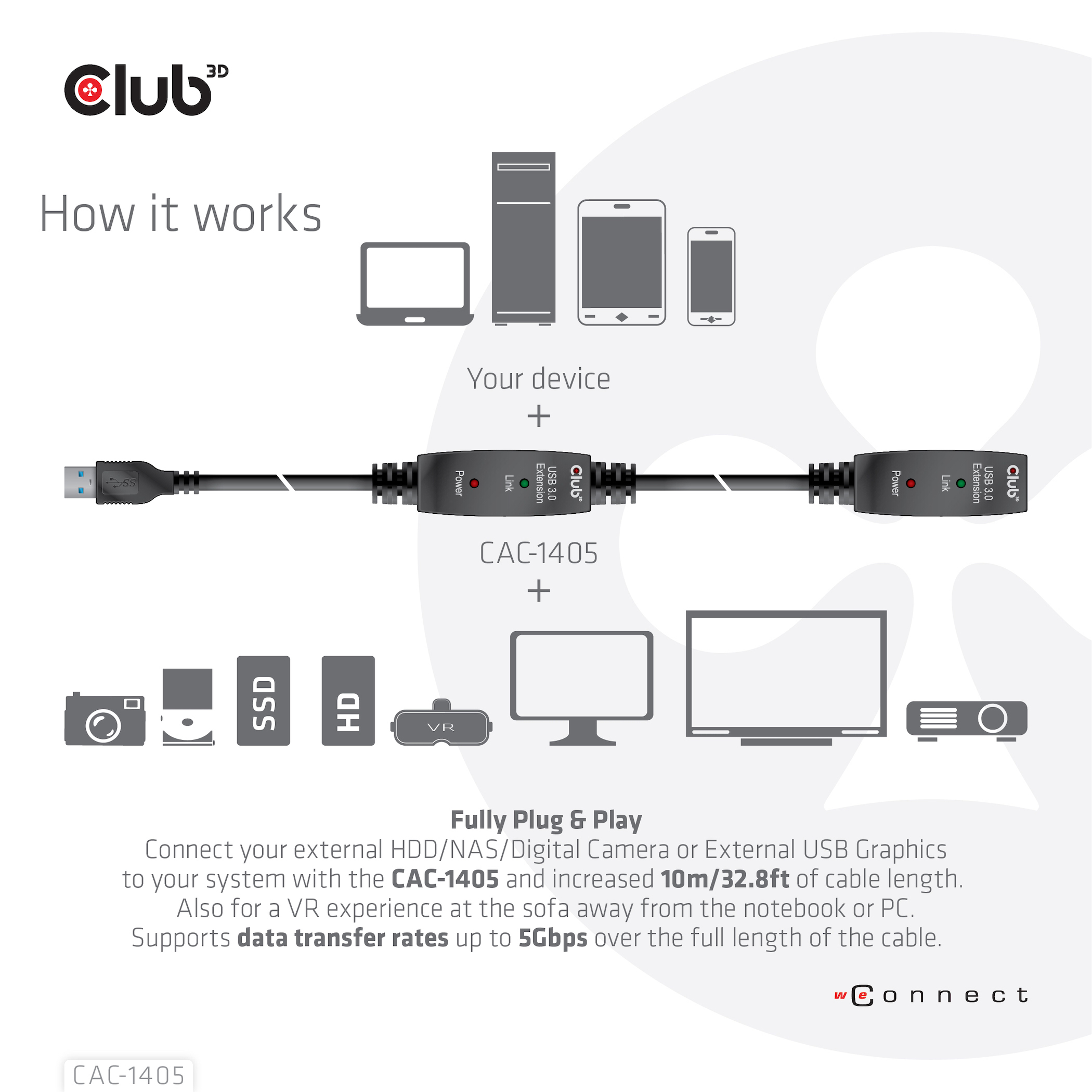 With this Club3D USB 3.2 Gen1 Active Repeater Cable CAC-1405, you can go far beyond the standard USB Cable length limitation of 3 meters /9.84 feet, without loss of Data Transfer Speed. The USB 3.2 Gen1 Active Repeater Cables are fully Plug & Play and do not require any driver installation. Just connect your external USB device like External HDD/NAS/Digital Camera or External USB Graphics to your system with the CAC-1405 and have flexibility of the increased 10 meters of extra cable length. Also for a VR experience at the sofa away from the notebook or PC this cable provides you with the freedom of movement.
