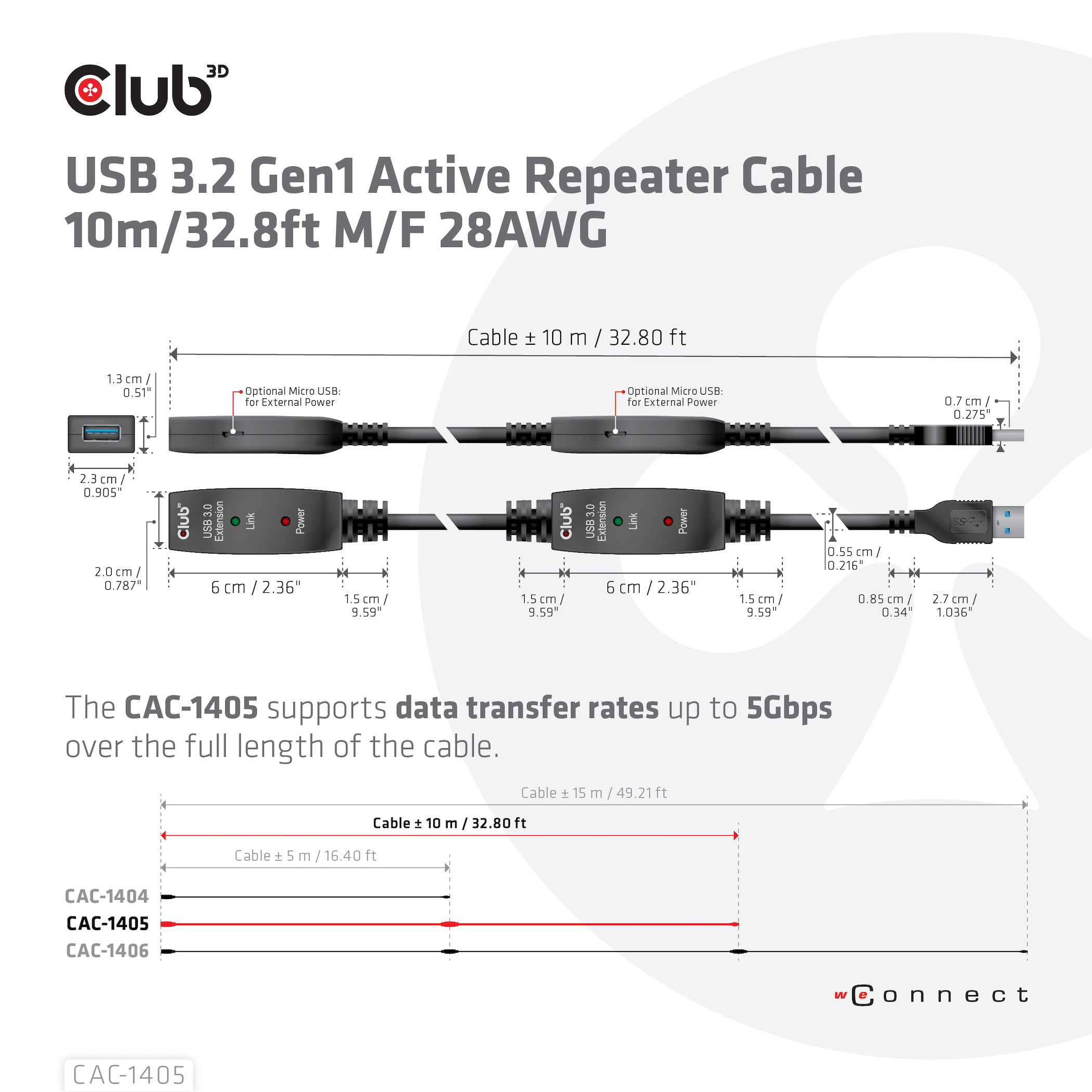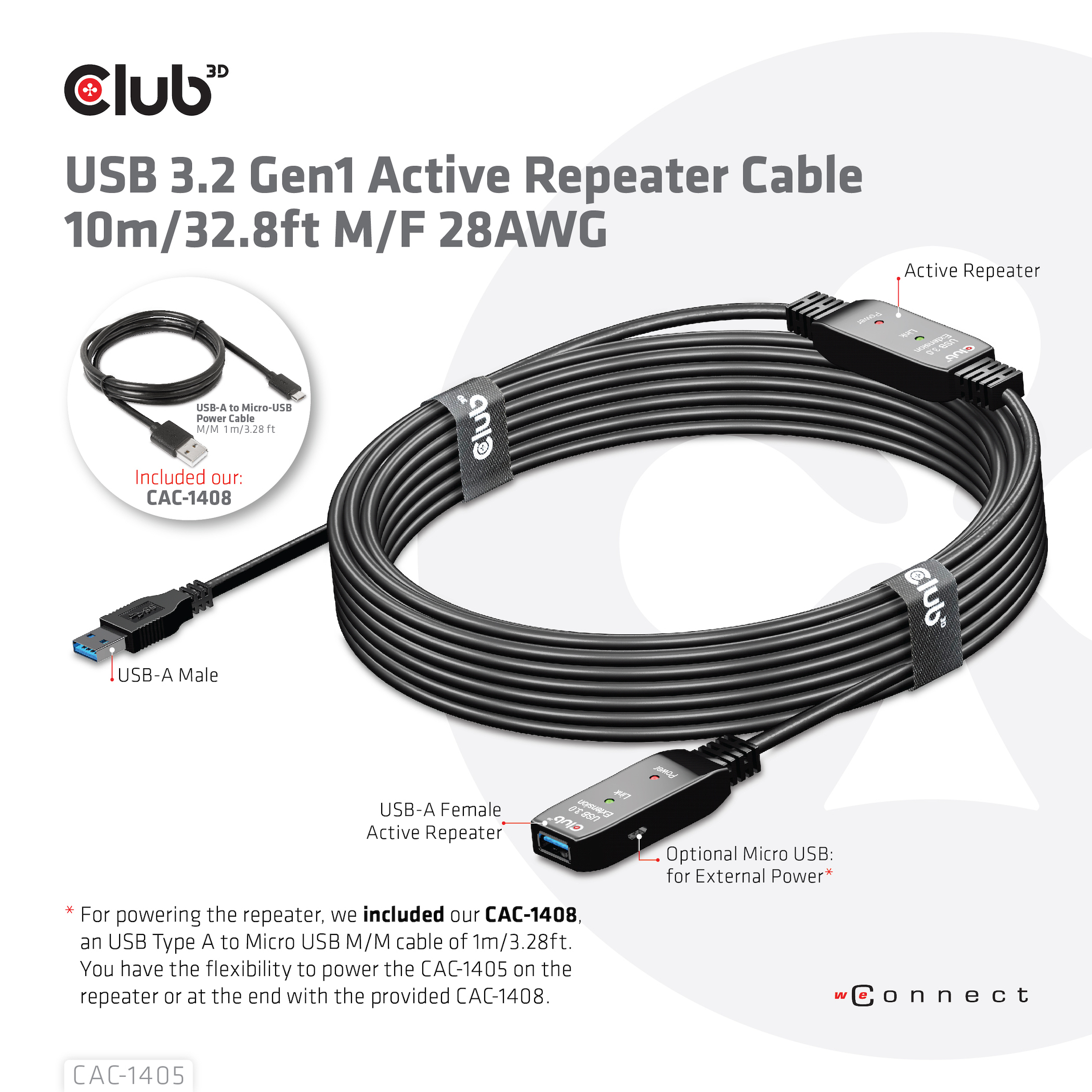 Kompatible produkter For powering the repeater, we included our CAC-1408, an USB Type A to Micro USB M/M cable of 1m/3.28ft. You have the flexibility to power the CAC-1405 on the repeater or at the end with the provided CAC-1408.