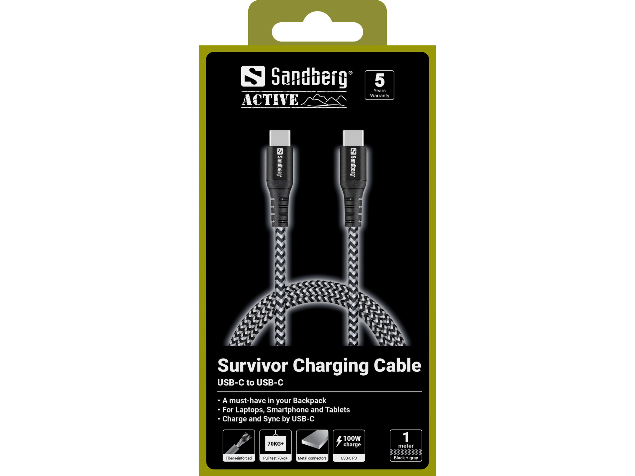 Sandberg Survivor USB-C- USB-C Cable 1M, 1 m, USB C, USB C, USB 2.0, Sort, Grå