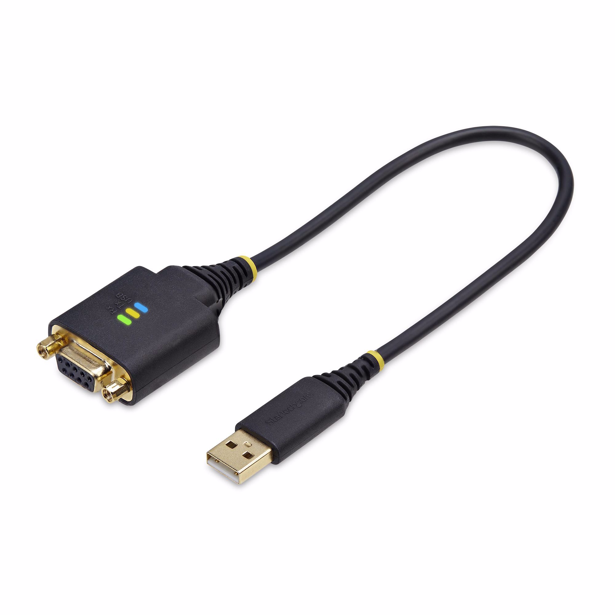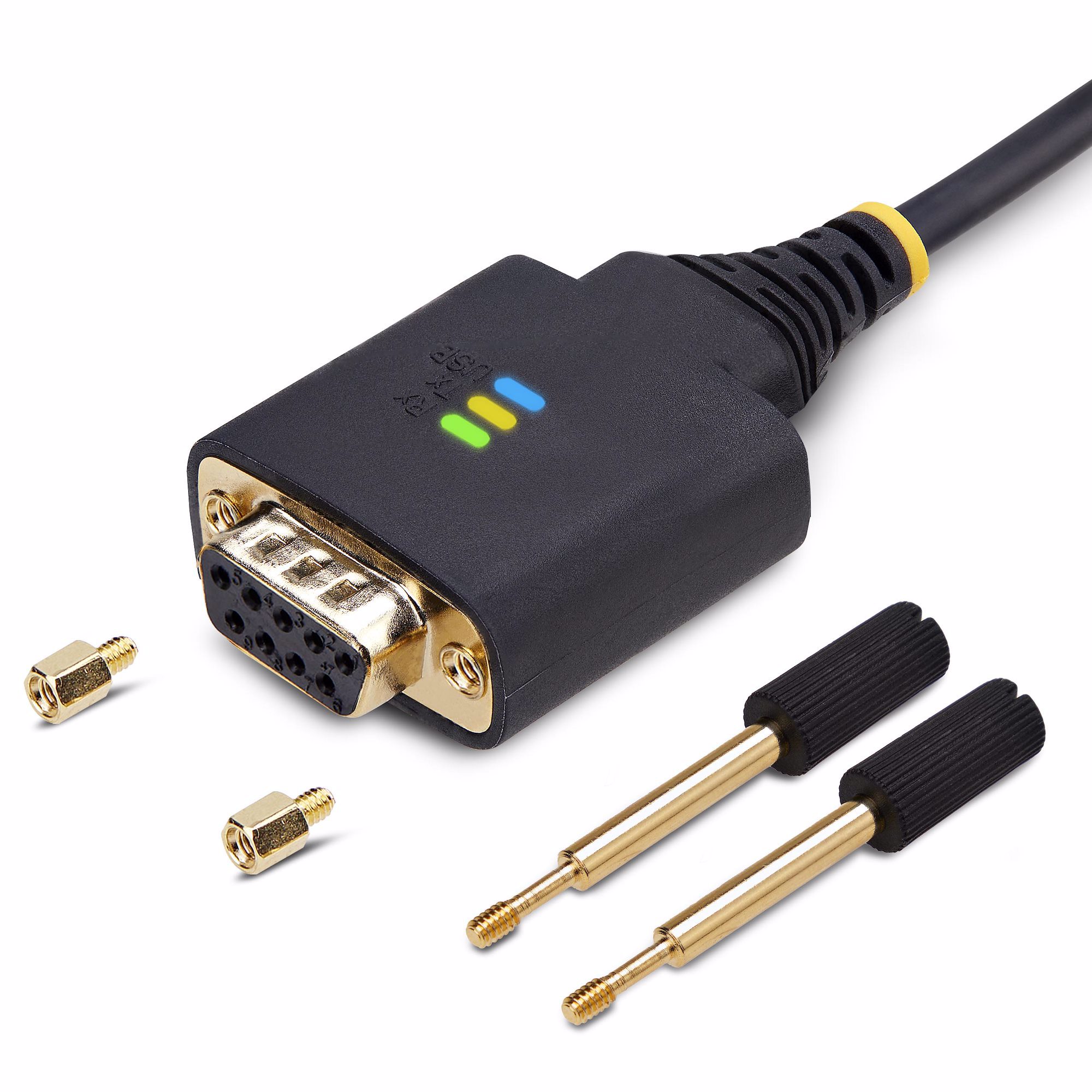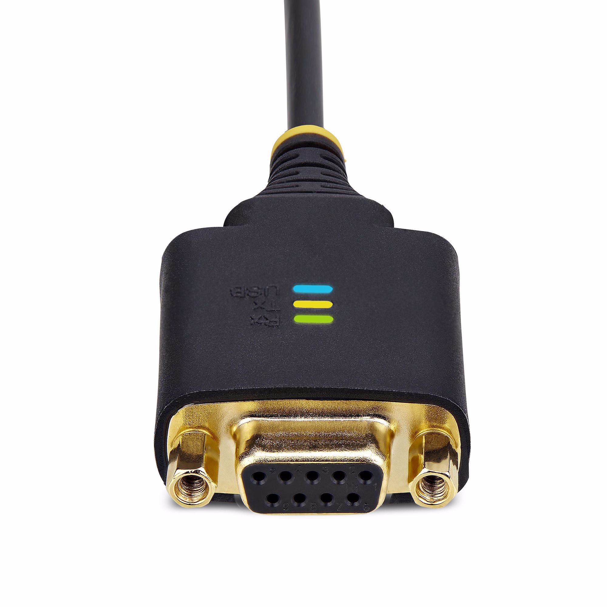 The 1-foot (30-centimeter) Null Modem USB Serial Adapter adds an RS-232 serial DB/DE-9 (female) connector to a desktop or laptop via a USB Type-A port. Secure the adapter to a serial device, using pre-installed and removable DB-9 nuts, or install the included slotted D-Sub thumbscrews for compatibility with other serial peripheral devices or cables.