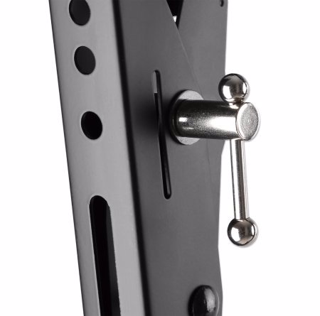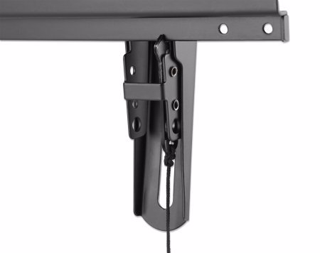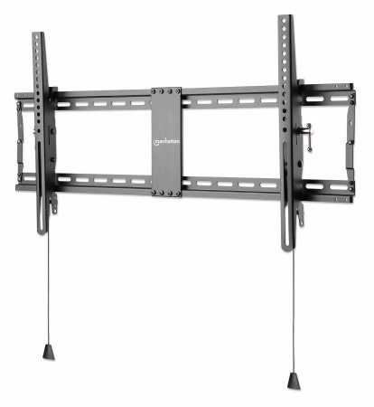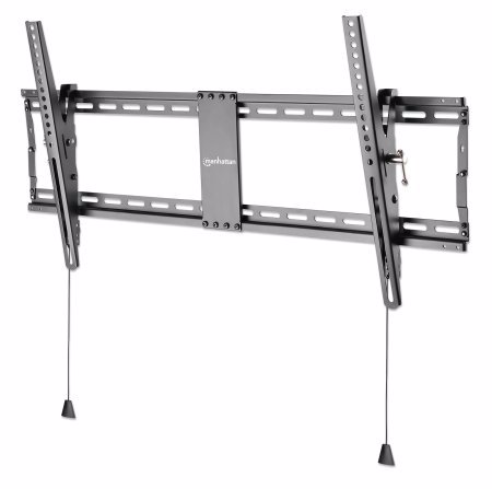 This tilting TV Wall Mount from Manhattan safely holds your TV and offers a toolless +3 to -12° tilt adjustment with the turn of a knob for optimized views. Constructed of 2 mm thick reinforced powder-coated steel, it fits flat and curved LCD, OLED or plasma TVs up to 100" and weighing up to 70 kg (154 lbs.) with VESA compliance up to 800x400. You're all set for a confident above-the-floor installation with an included bubble level that helps get the mount perfectly horizontal on the wall, and intuitive snap-in spring locks with release cords let you easily and securely put the TV in place. It's ideal for residential, office, hospitality, classroom, conference room, digital signage and other commercial applications. An anti-theft opening allows you to attach a padlock to prevent your valuable display from being removed and stolen.